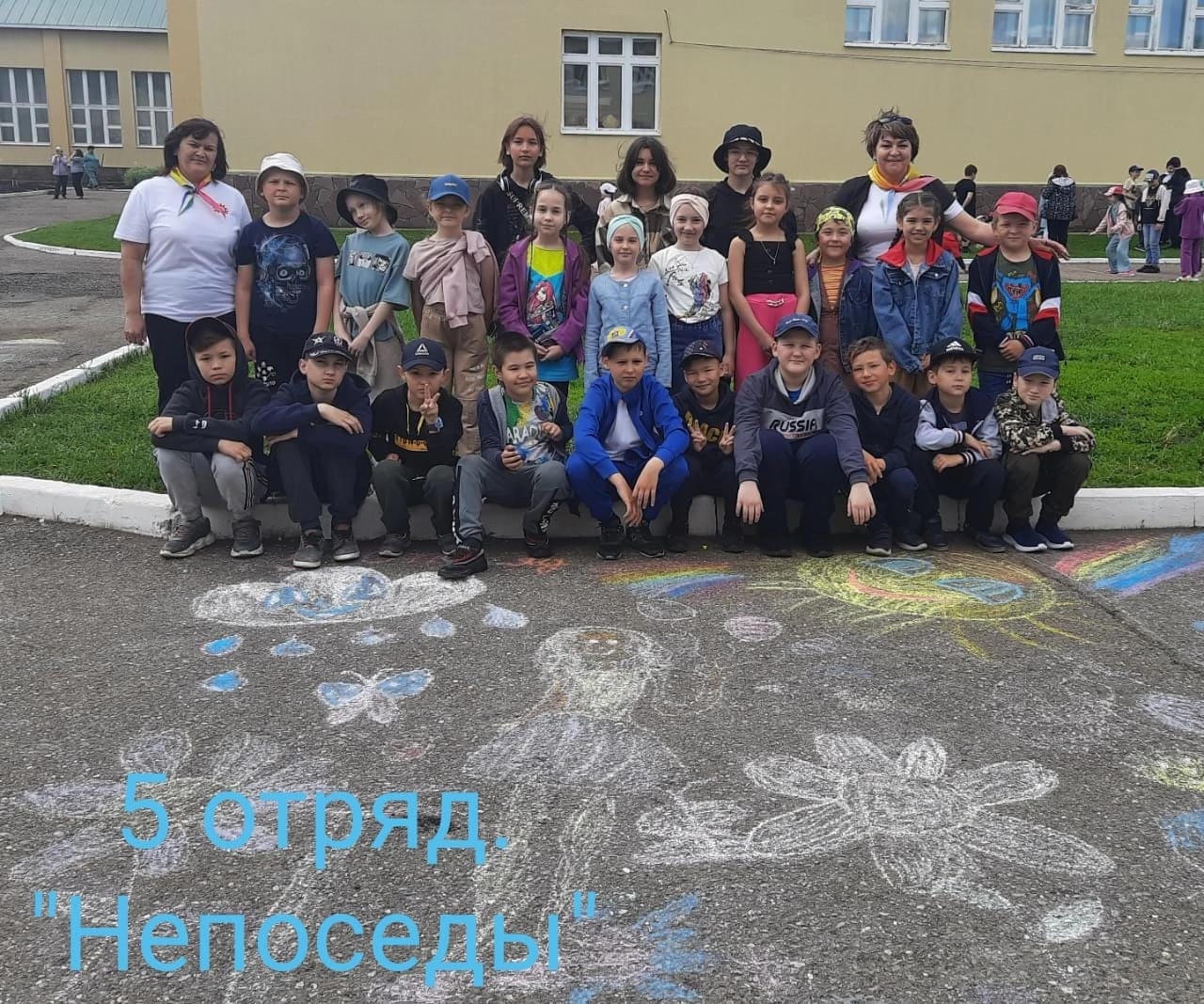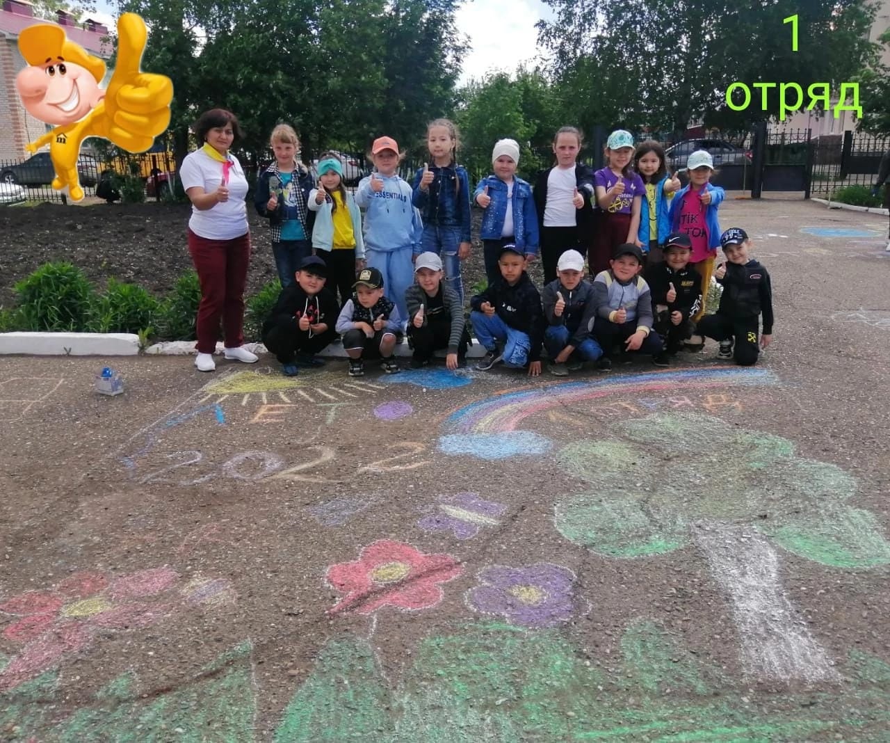 Ребята нарисовали цветными мелками яркие, красочные рисунки на асфальте.