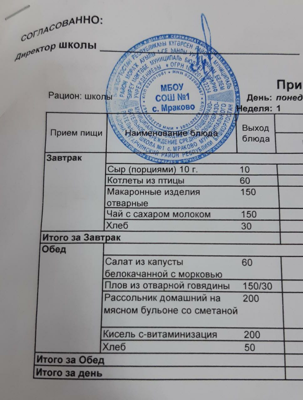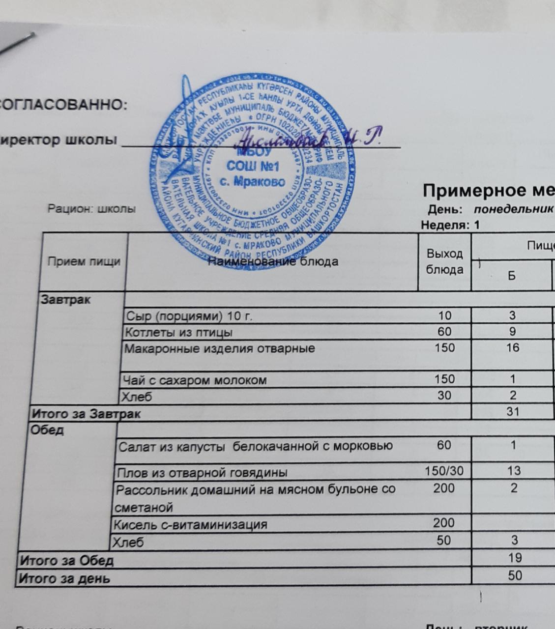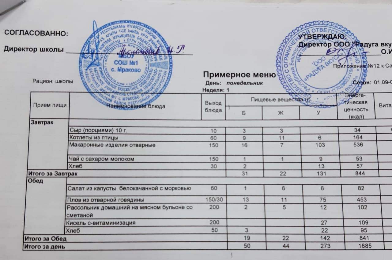 Питание в школе организует УФЭРИ Администрация муниципального района Кугарчинский район Республики Башкортостан - МБОУ СОШ № 1 с.Мраково, л/с 20013040230