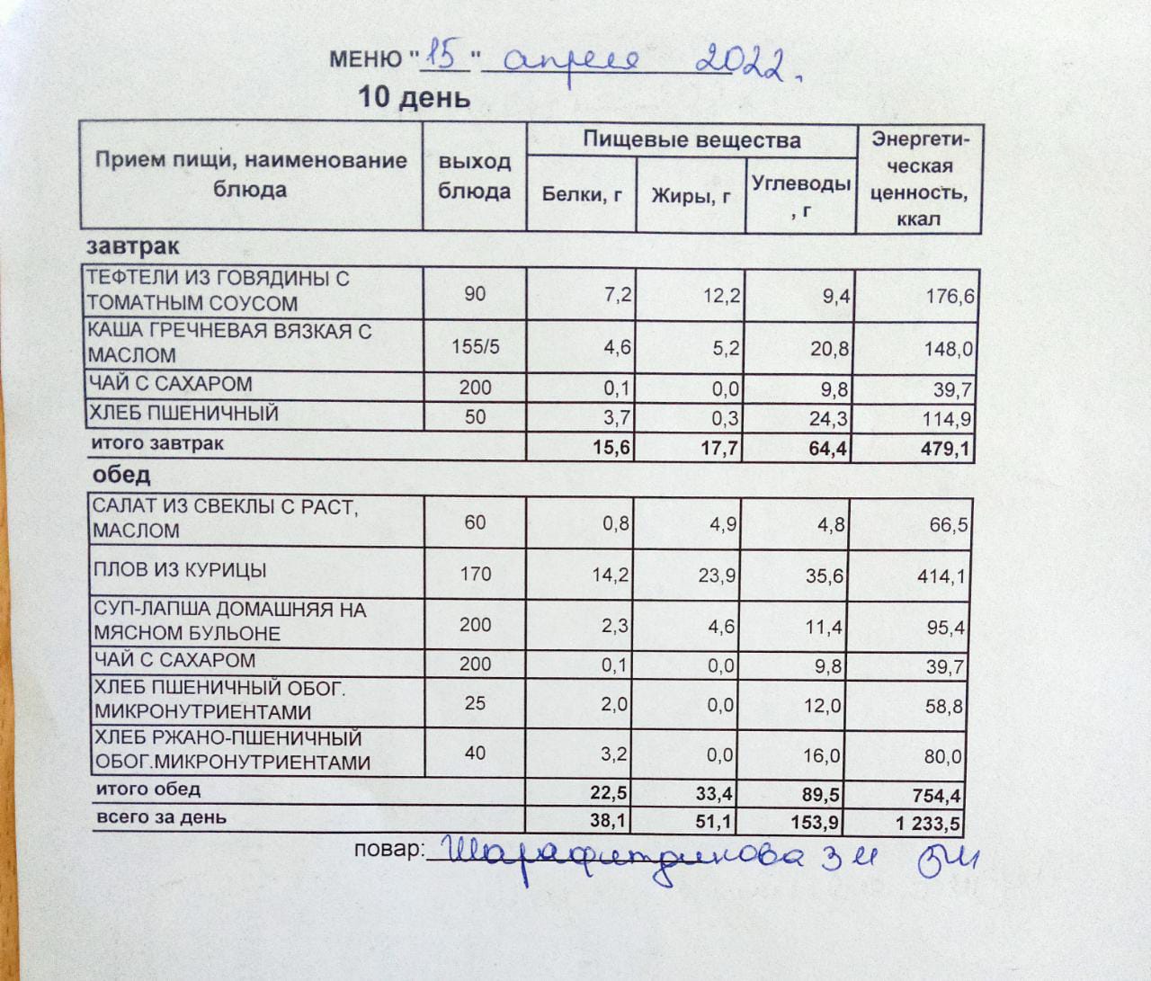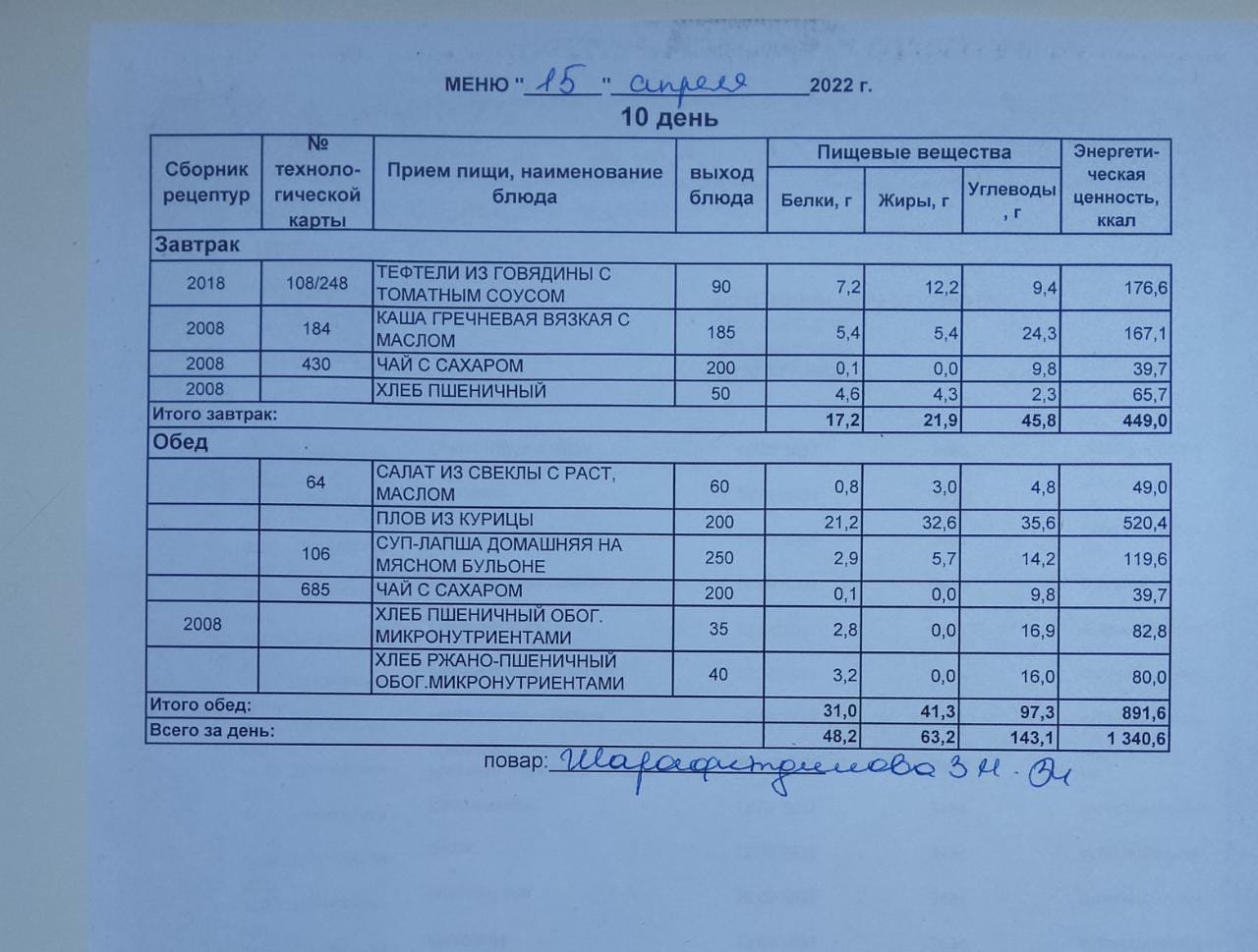 (Меню на 15.04.2022 г. обучающихся главного корпуса)