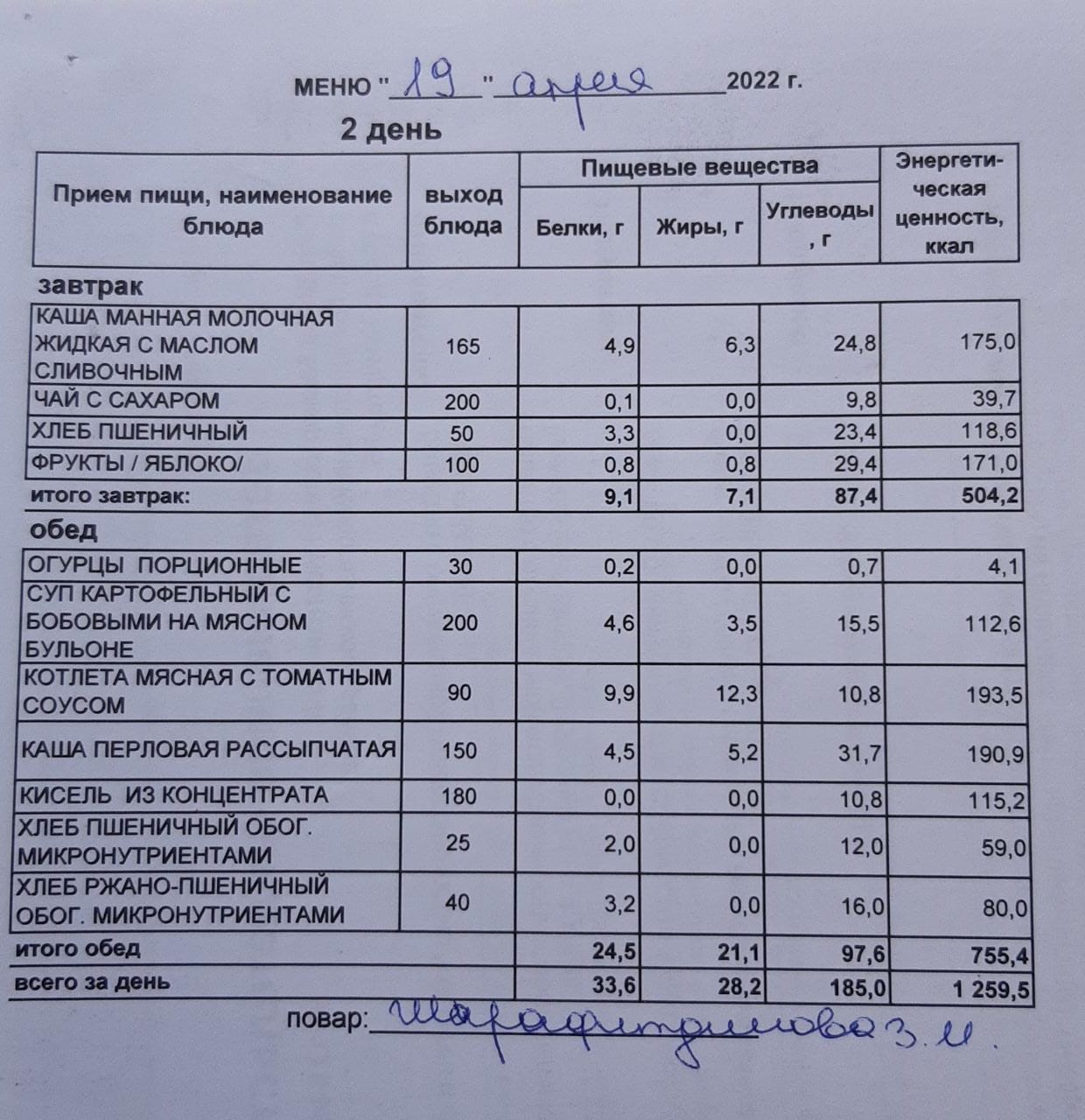 (Меню на 19.04.2022 г. обучающихся главного корпуса)