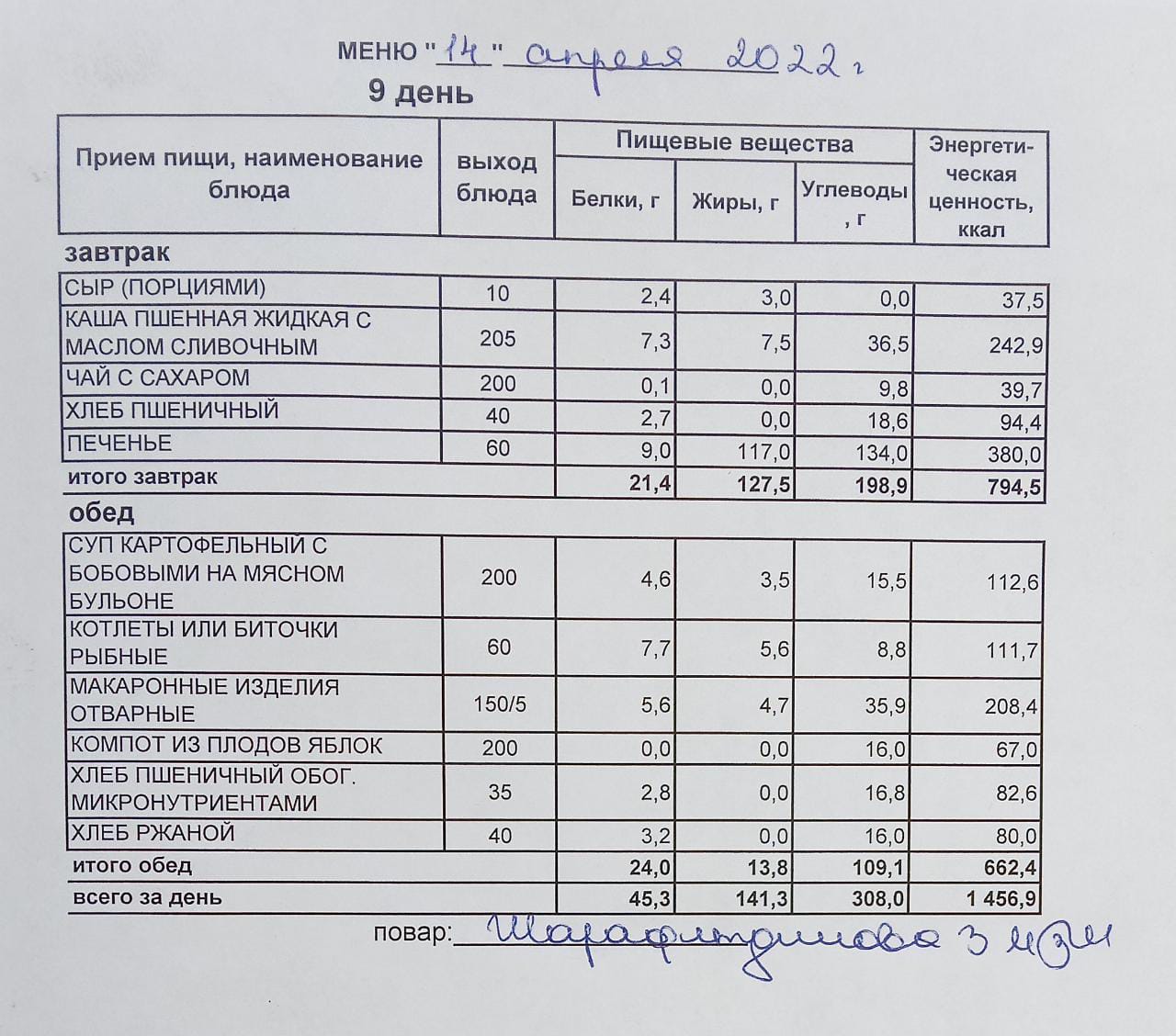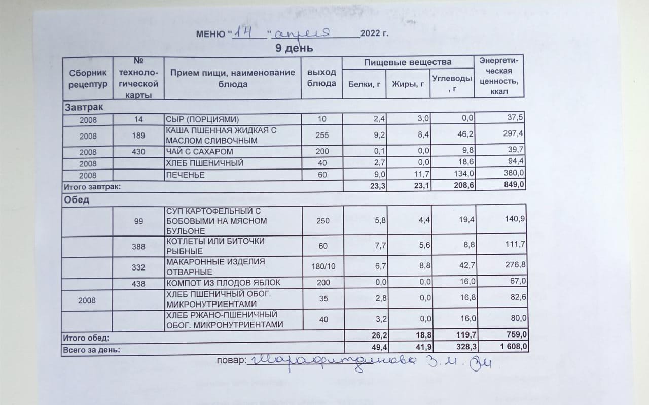 (Меню на 14.04.2022 г. обучающихся главного корпуса)