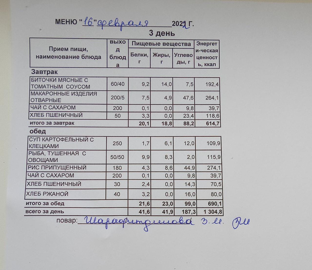 (Меню на 16.02.2022 г. обучающихся главного корпуса)