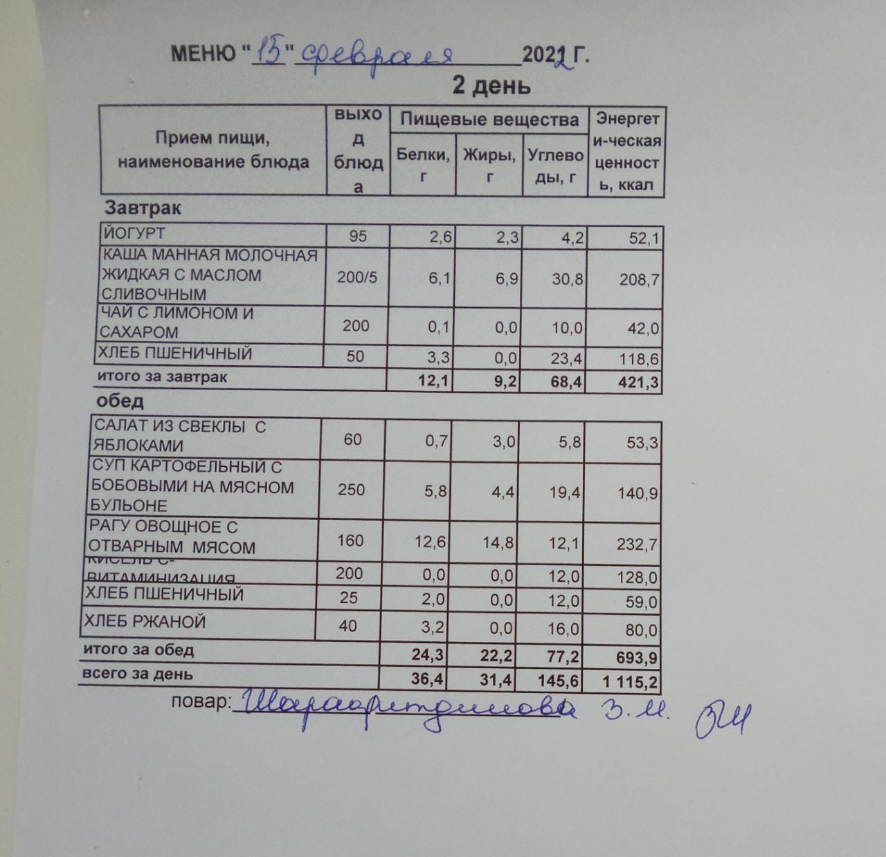(Меню на 15.02.2022 г. обучающихся начального корпуса)