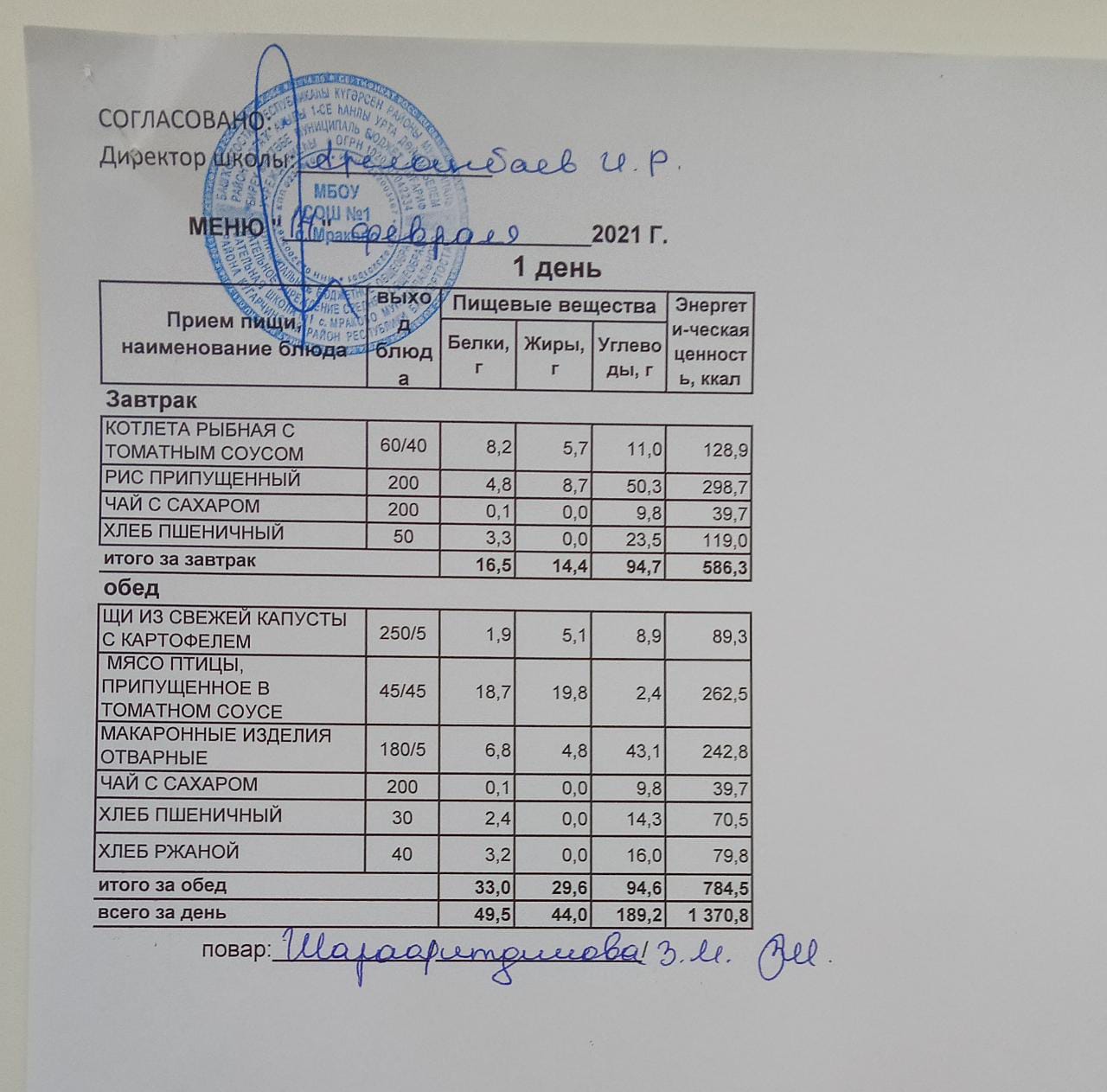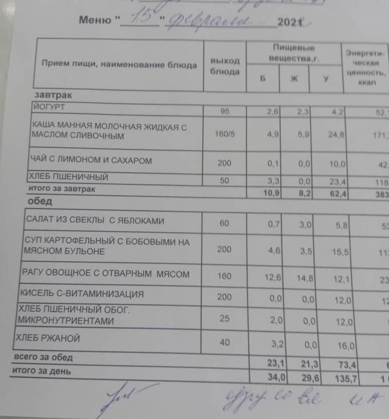 (Меню на 21.02.2022 г. обучающихся начального корпуса)