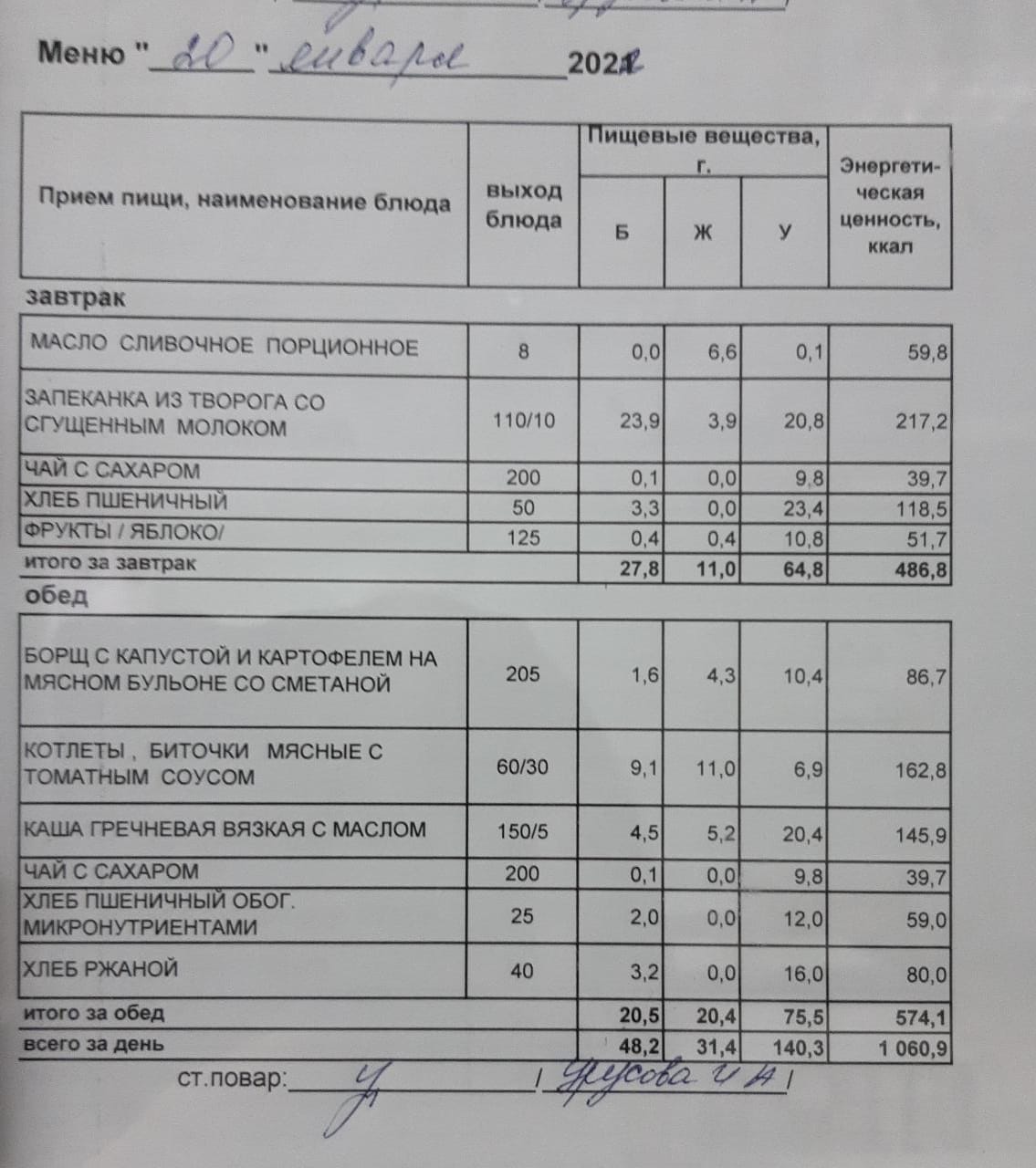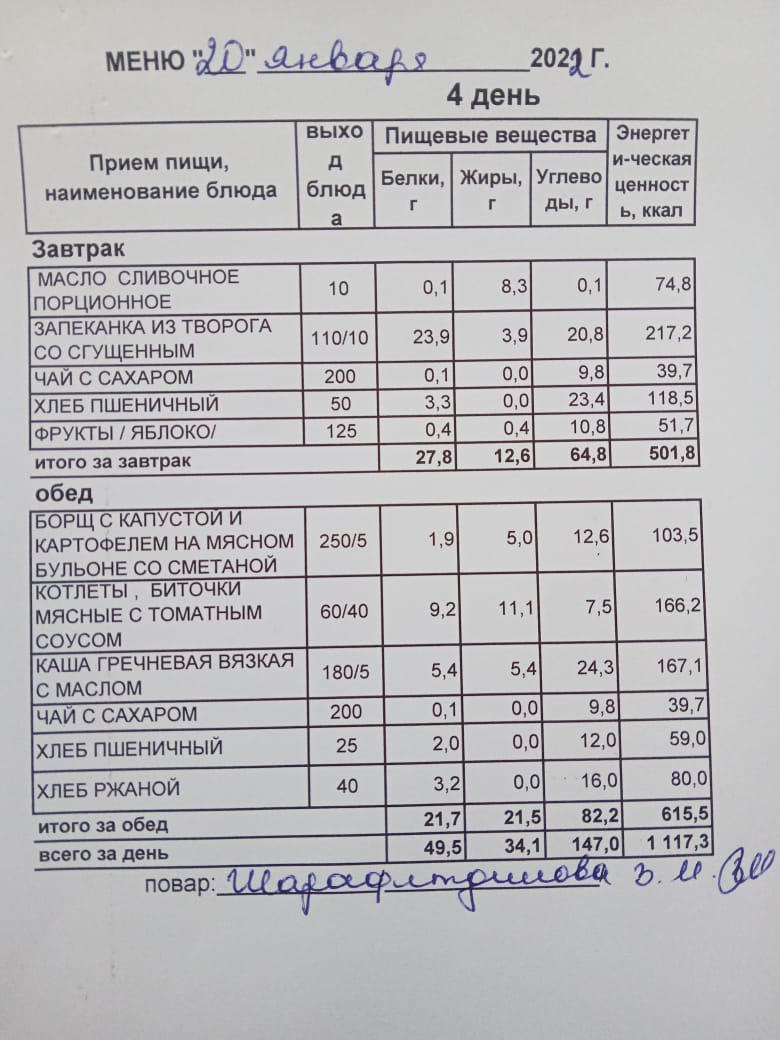 (Меню на 20.01.2022 г. обучающихся главного корпуса)