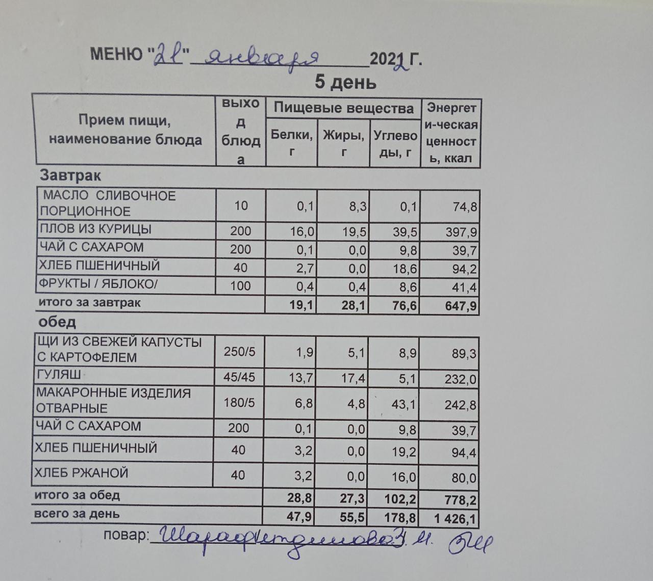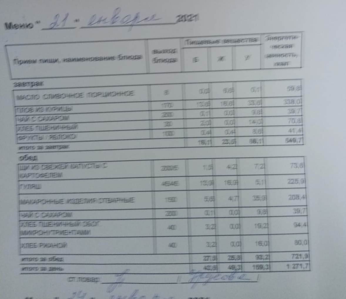 (Меню на 21.01.2022 г. обучающихся главного корпуса )