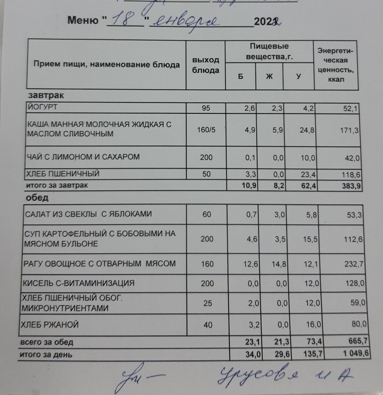 (Меню на 18.01.2022 г. обучающихся начального корпуса)