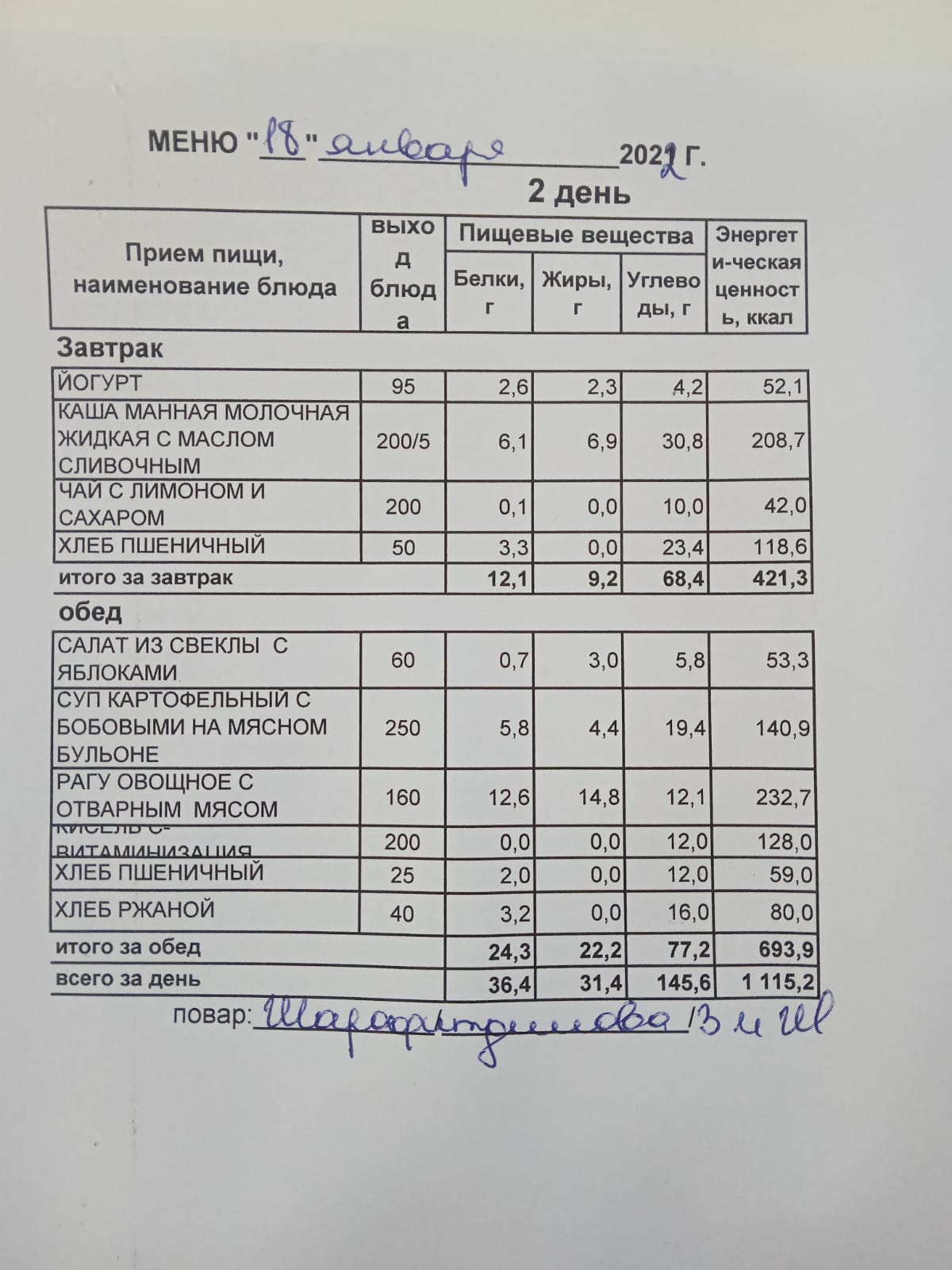 (Меню на 19.01.2022 г. обучающихся начального корпуса)