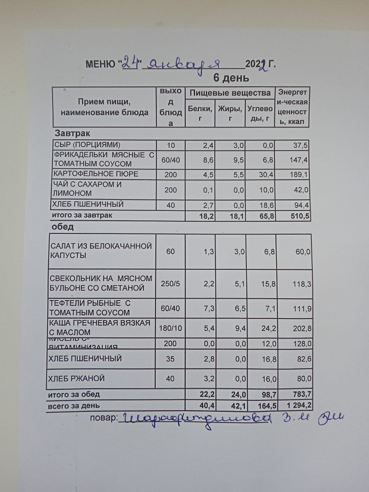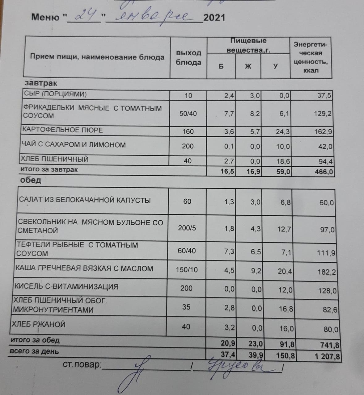 (Меню на 24.01.2022 г. обучающихся главного корпуса)