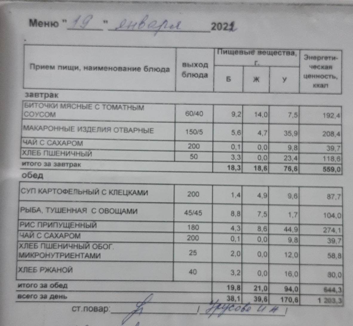 (Меню на 19.01.2022 г. обучающихся главного корпуса)