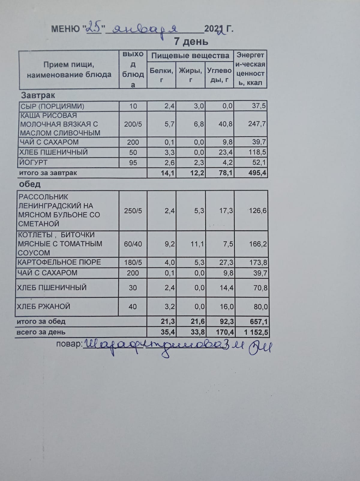 (Меню на 25.01.2022 г. обучающихся главного корпуса)