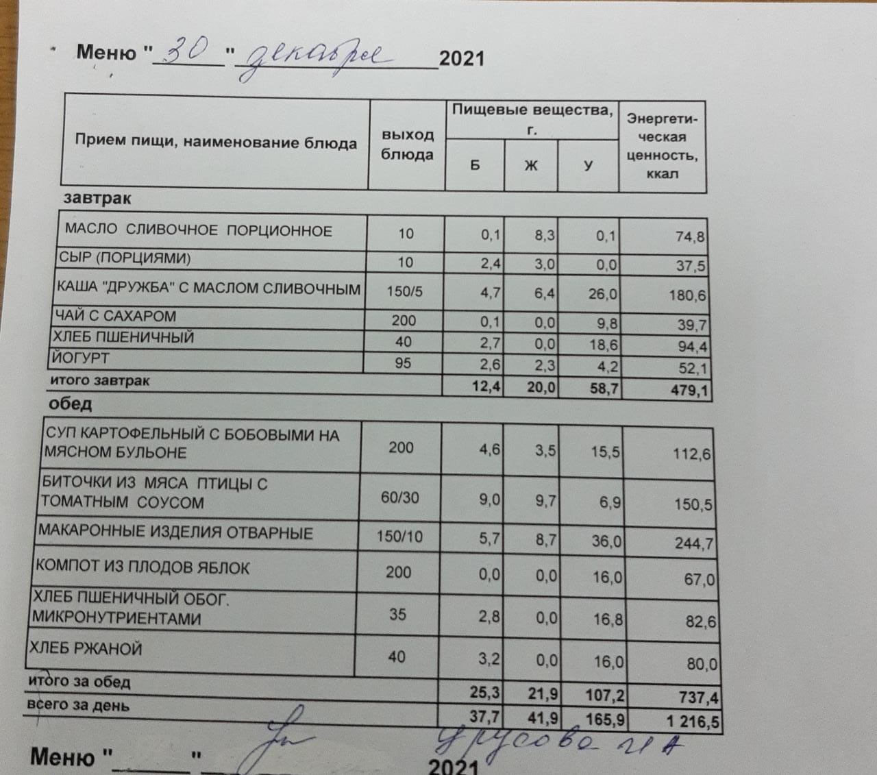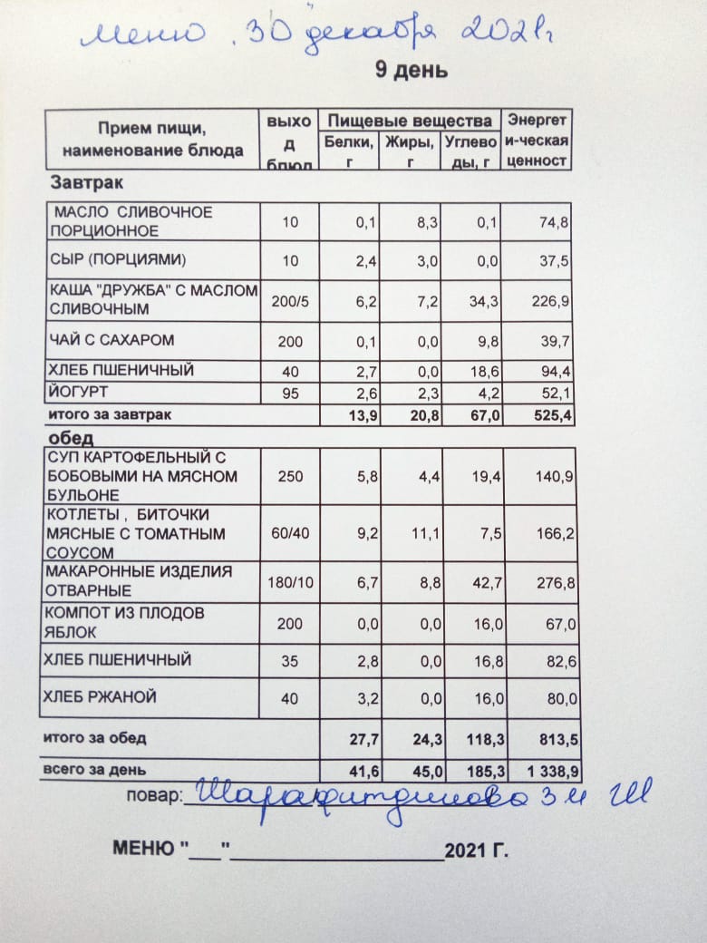 (Меню на 30.12.2021 г. обучающихся главного корпуса )