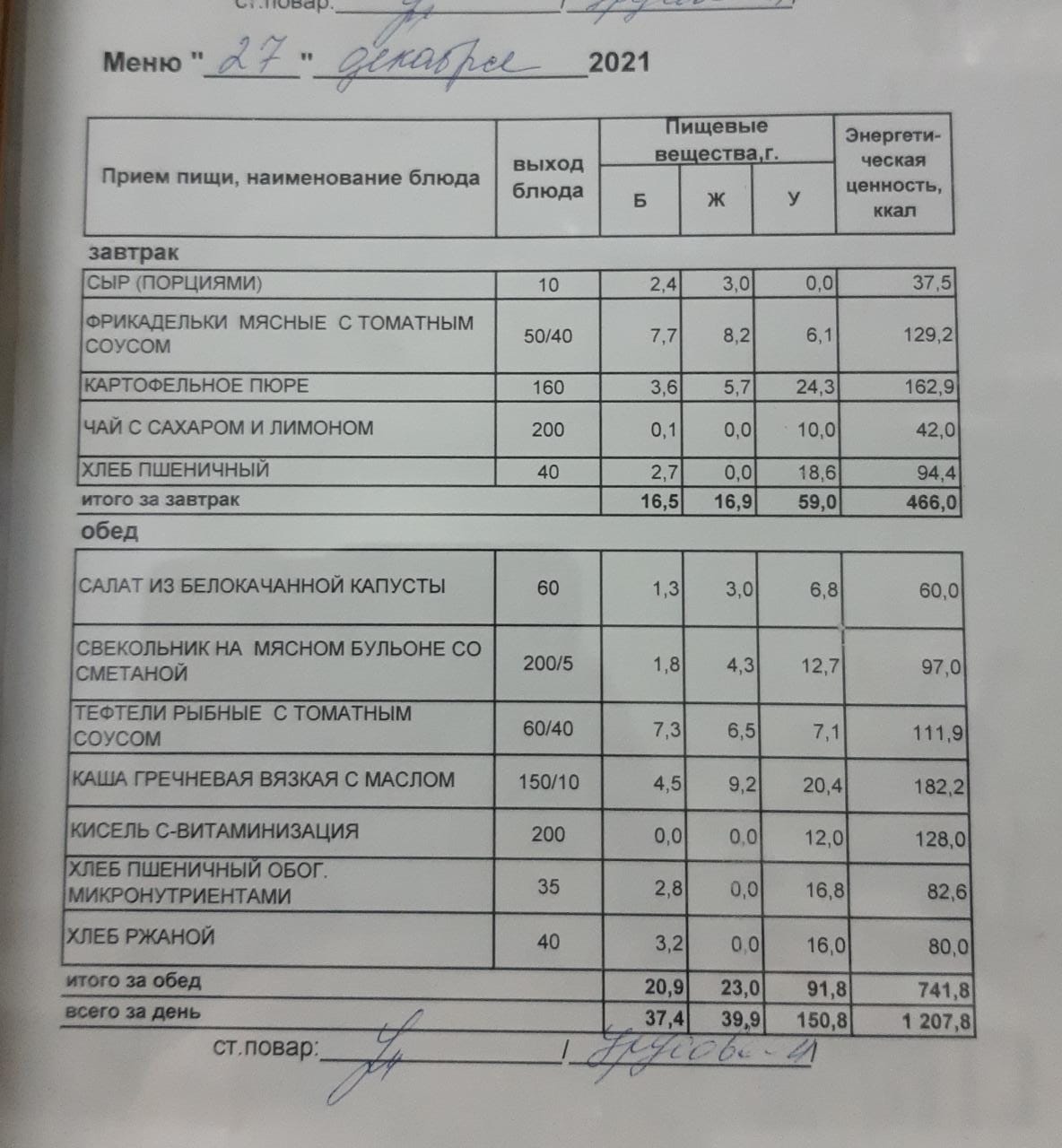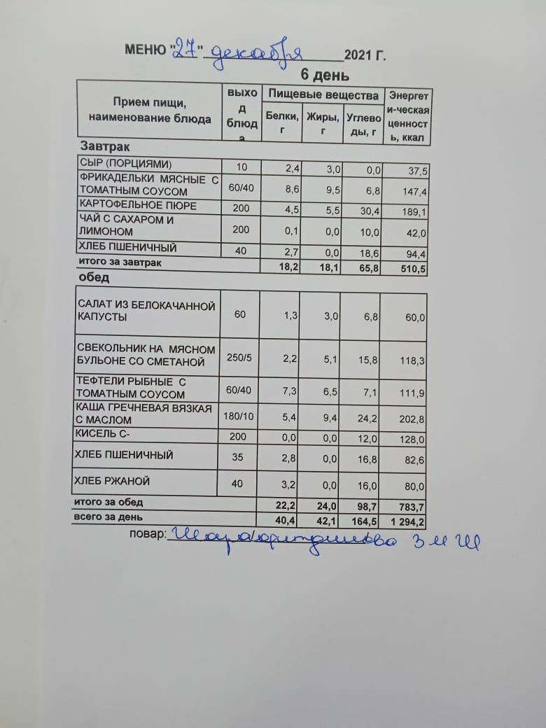(Меню на 27.12.2021 г. обучающихся главного корпуса)