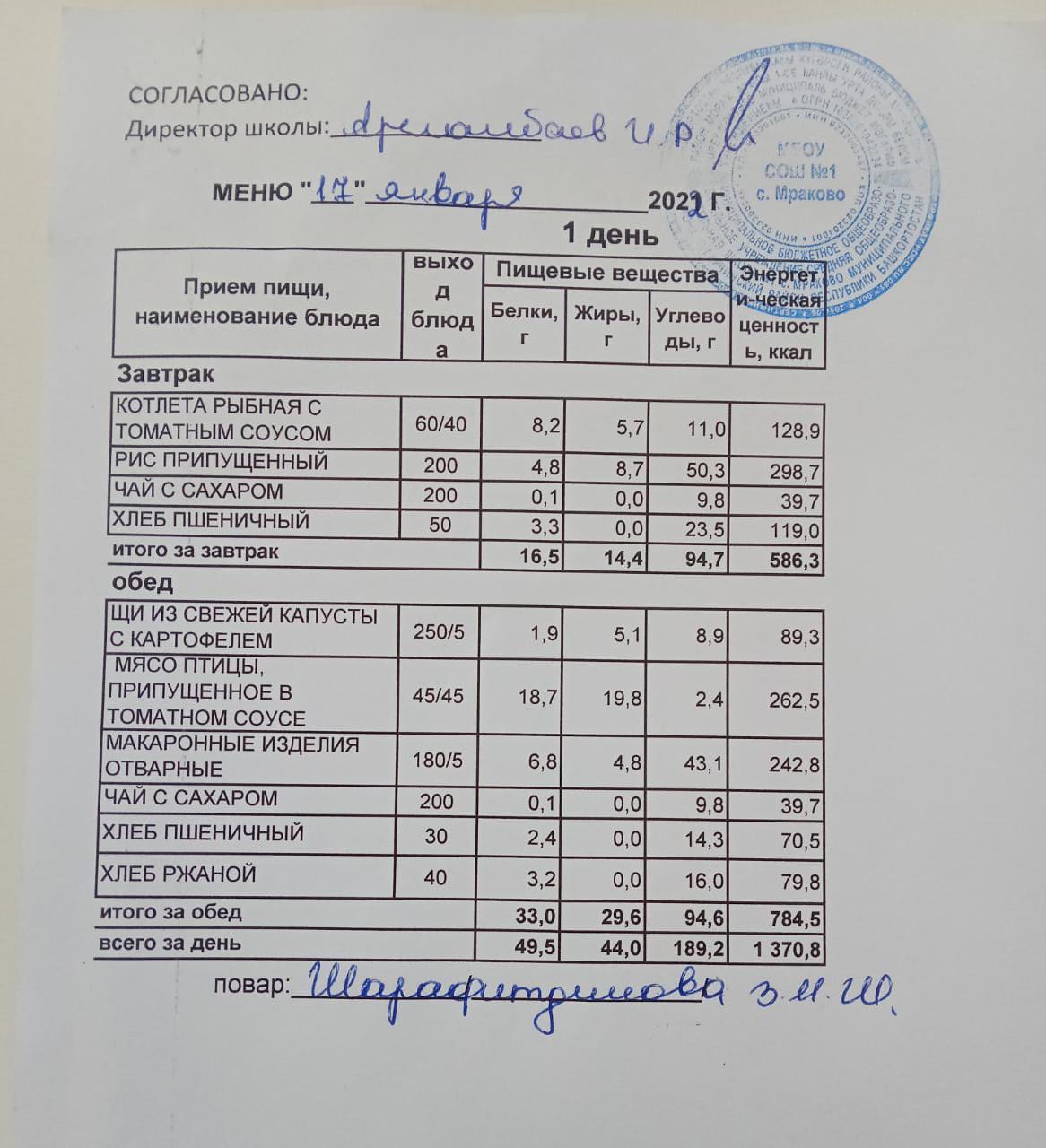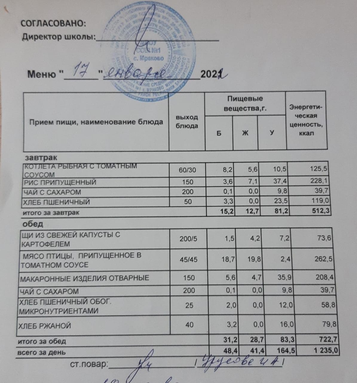 (Меню на 17.01.2022 г. обучающихся главного корпуса)
