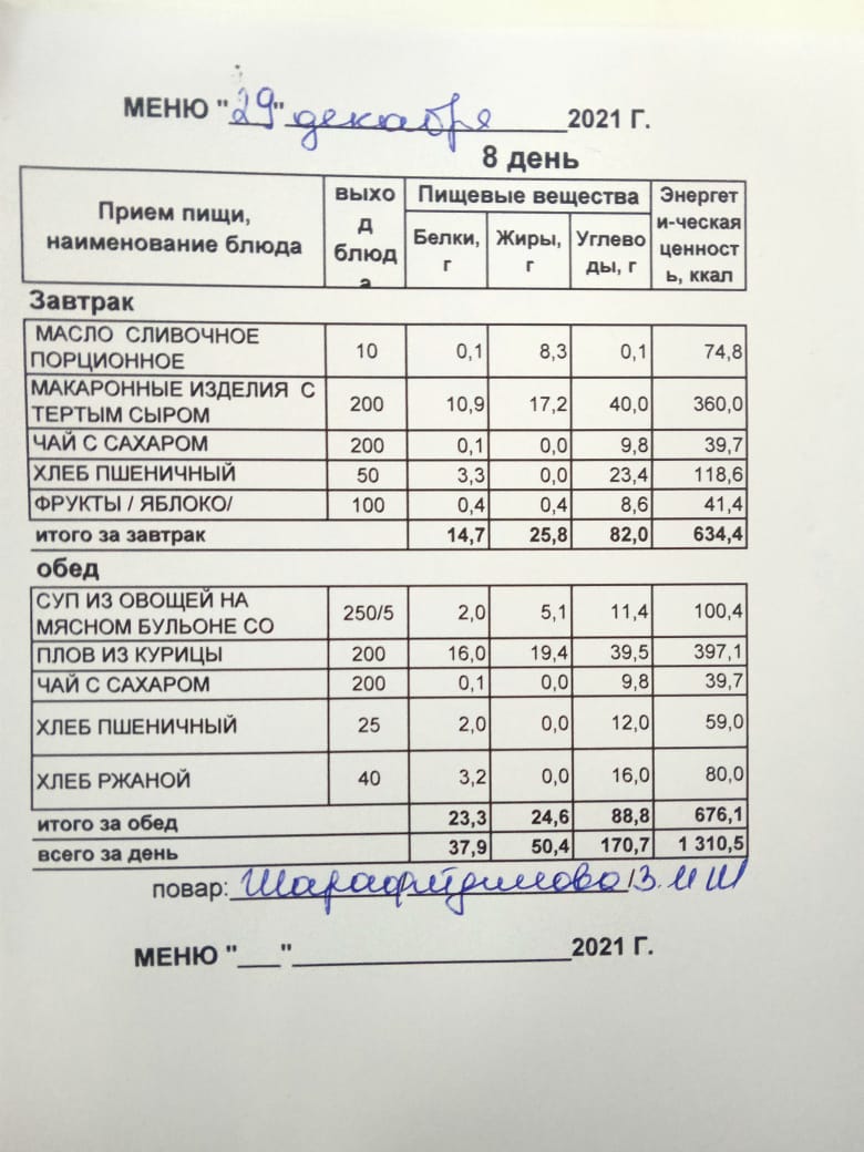 (Меню на 29.12.2021 г. обучающихся главного корпуса)