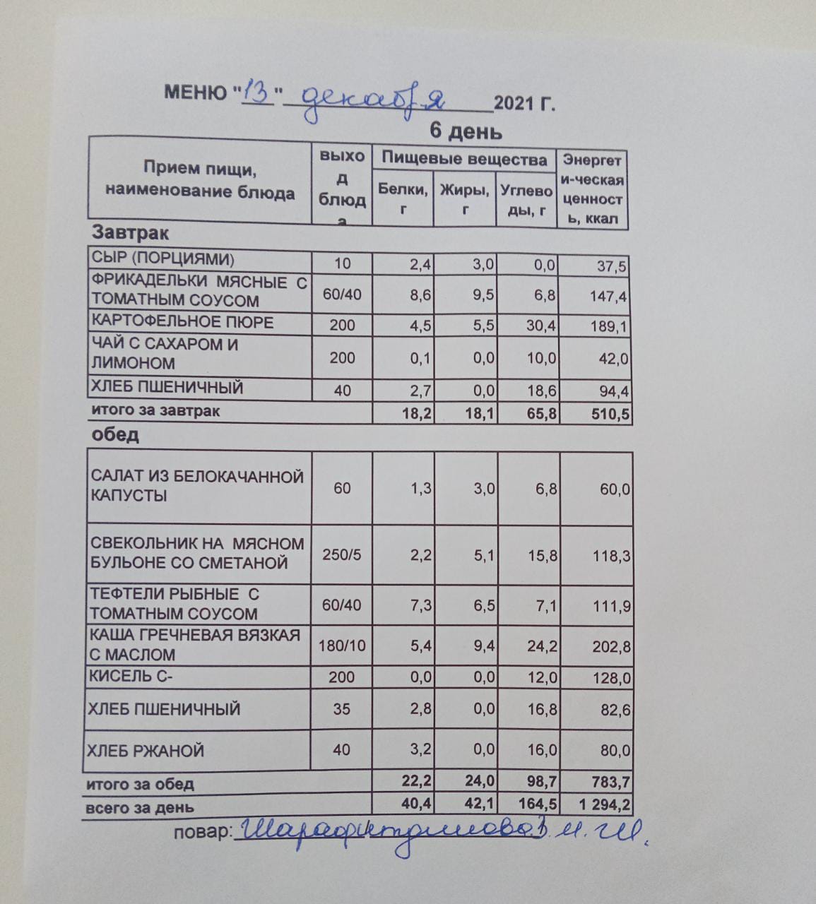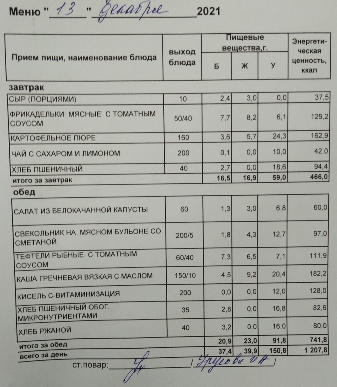 (Меню на 13.12.2021 г. обучающихся начального корпуса)