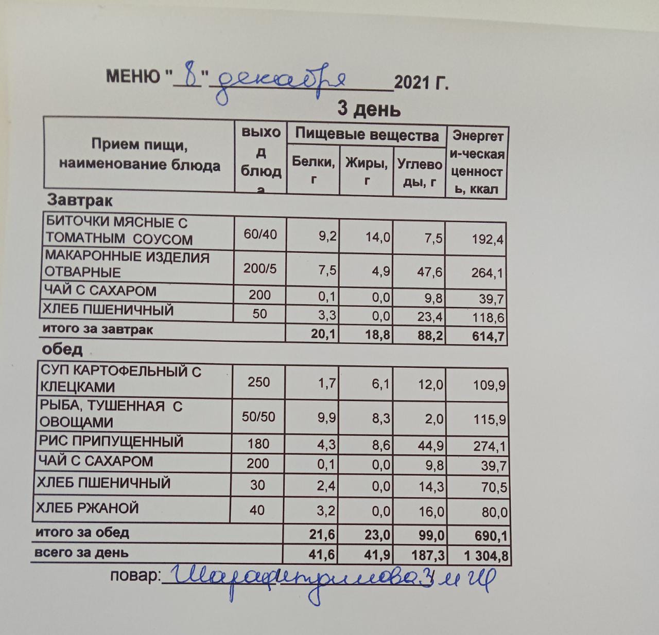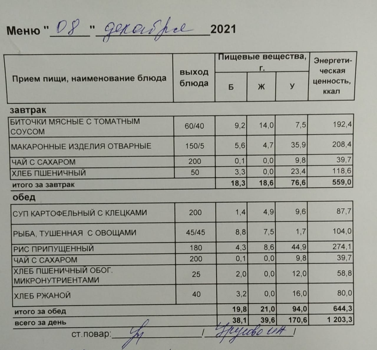 (Меню на 08.12.2021 г. обучающихся главного корпуса)