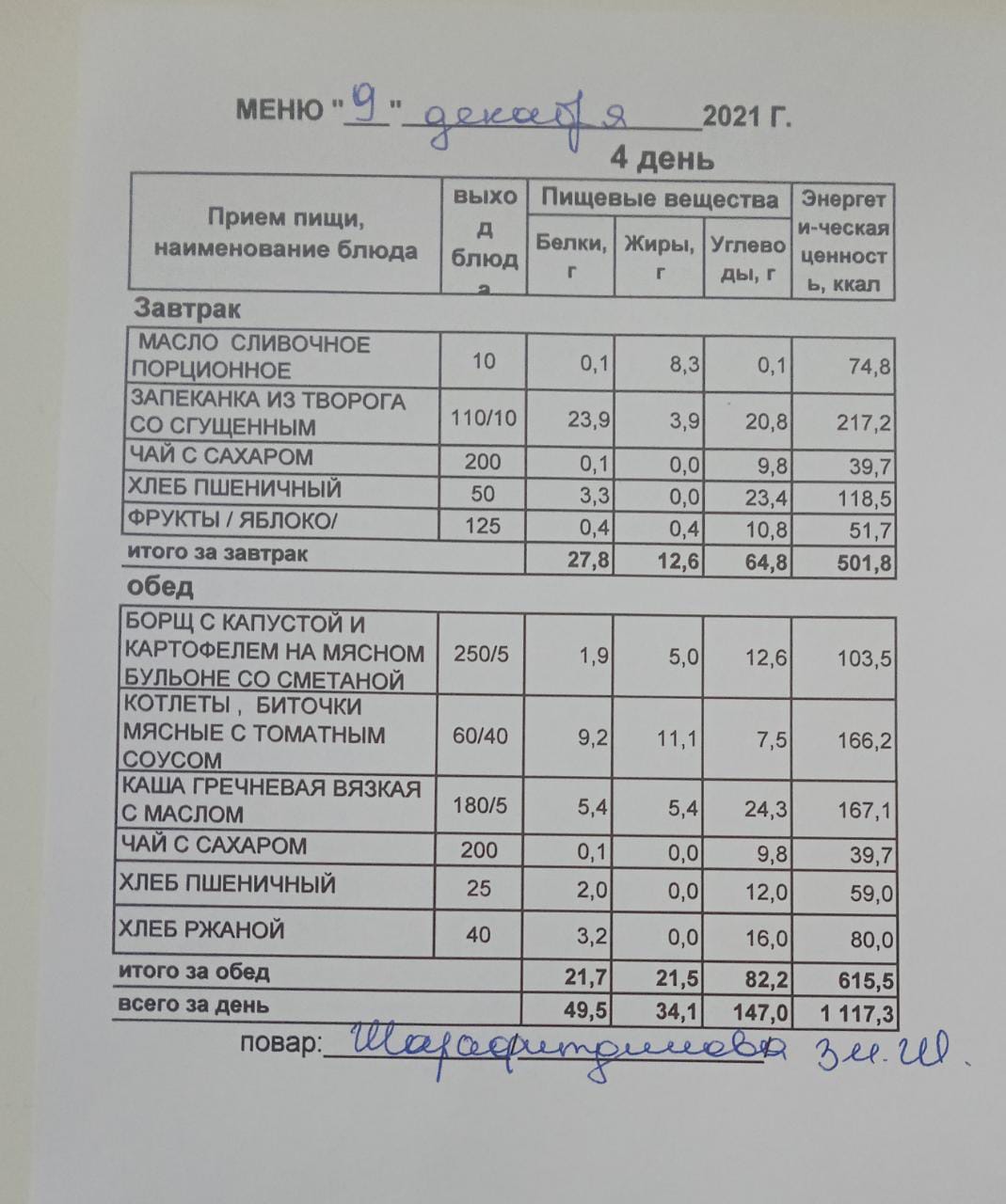(Меню на 09.12.2021 г. обучающихся начального корпуса)