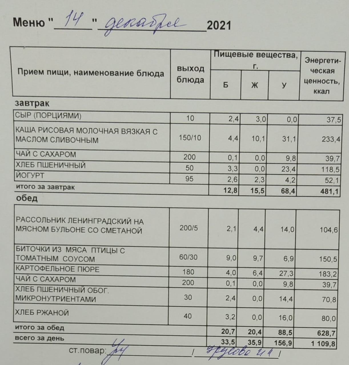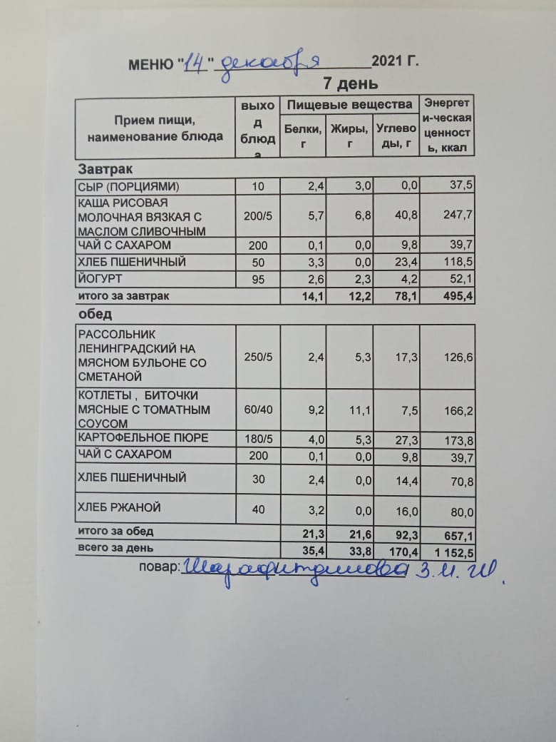 (Меню на 14.12.2021 г. обучающихся главного корпуса)