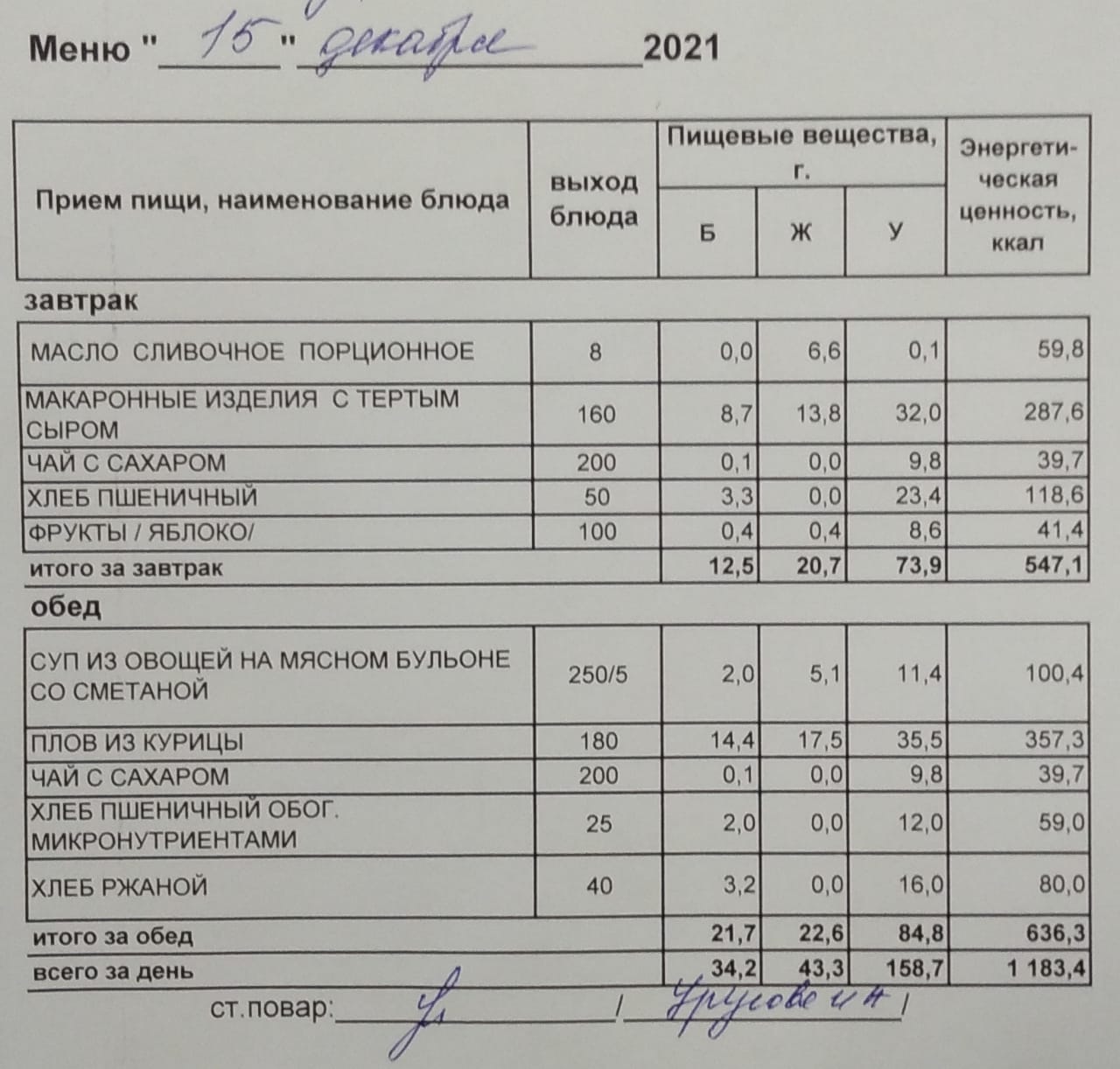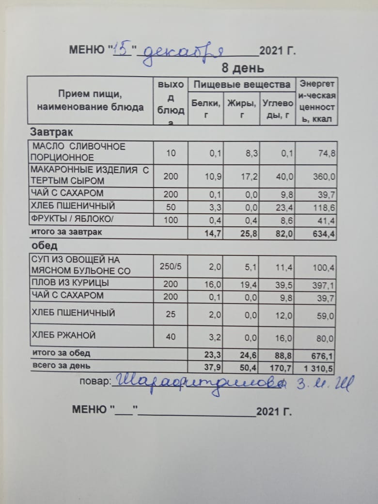 (Меню на 15.12.2021 г. обучающихся главного корпуса)