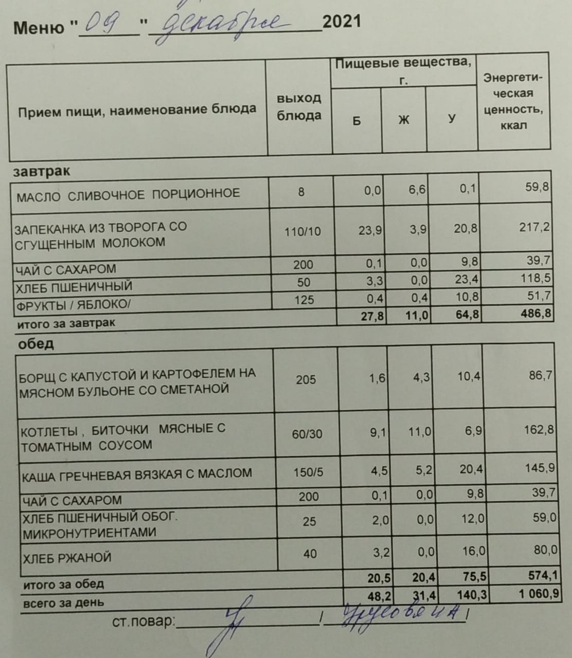 (Меню на 09.12.2021 г. обучающихся главного корпуса)