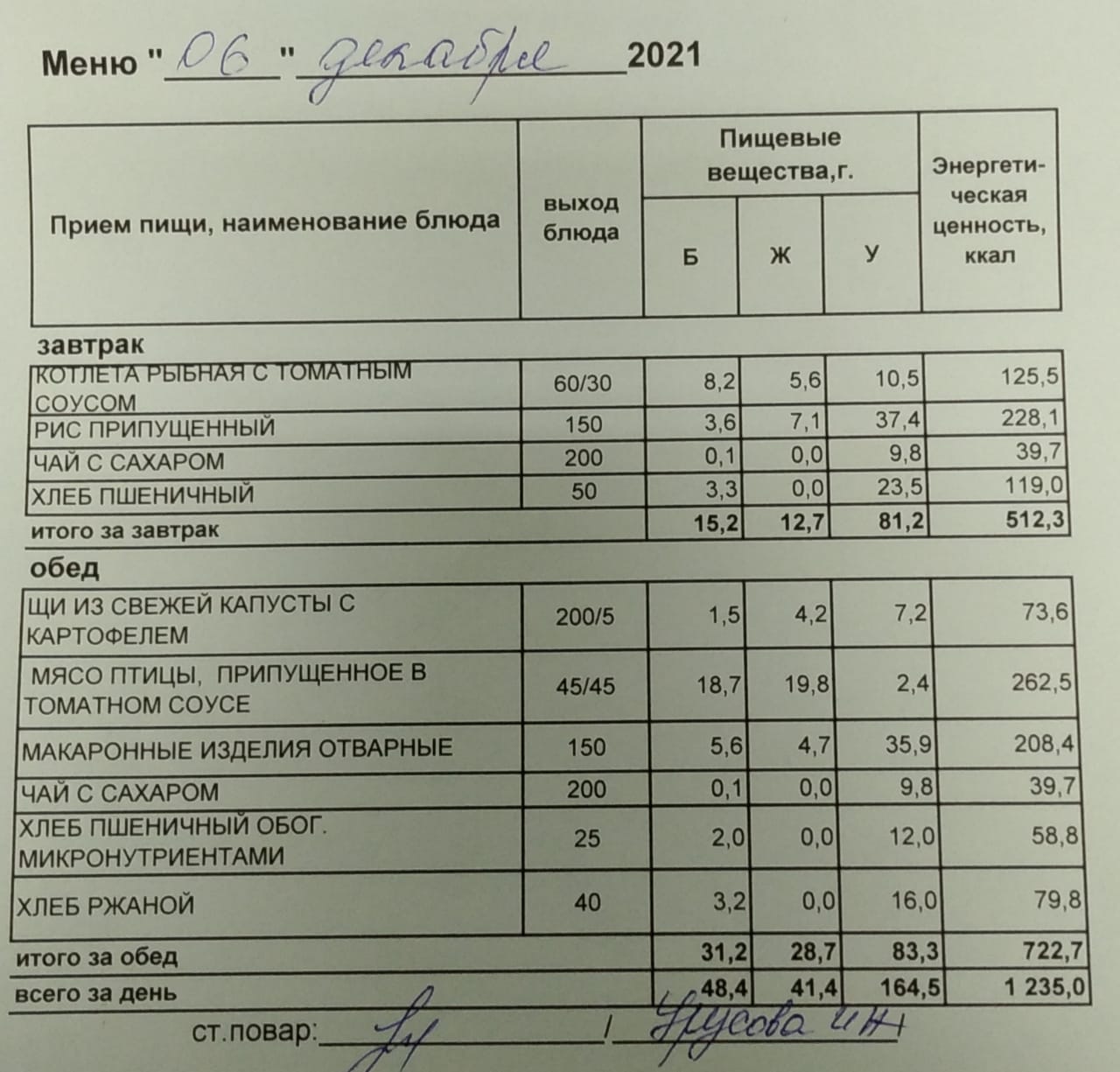 (Меню на 06.12.2021 г. обучающихся главного корпуса)
