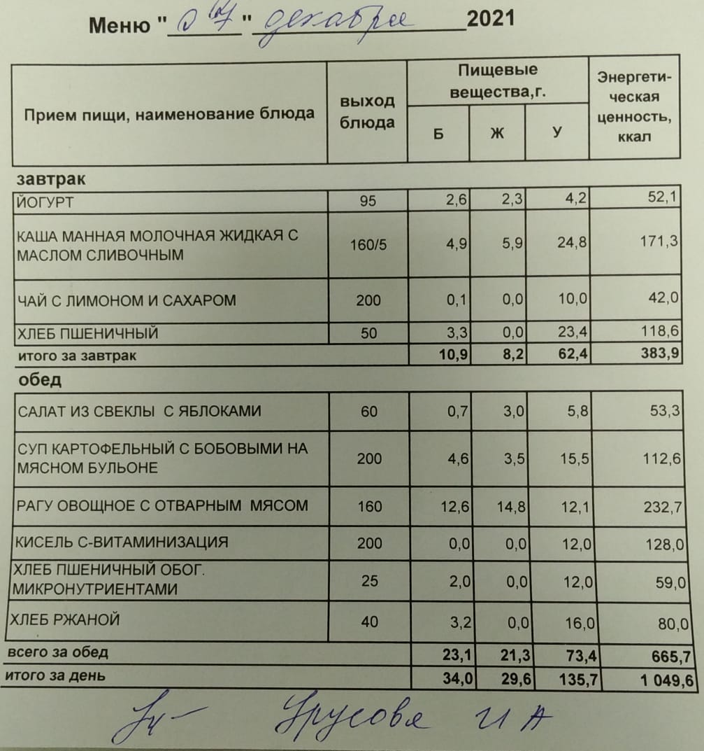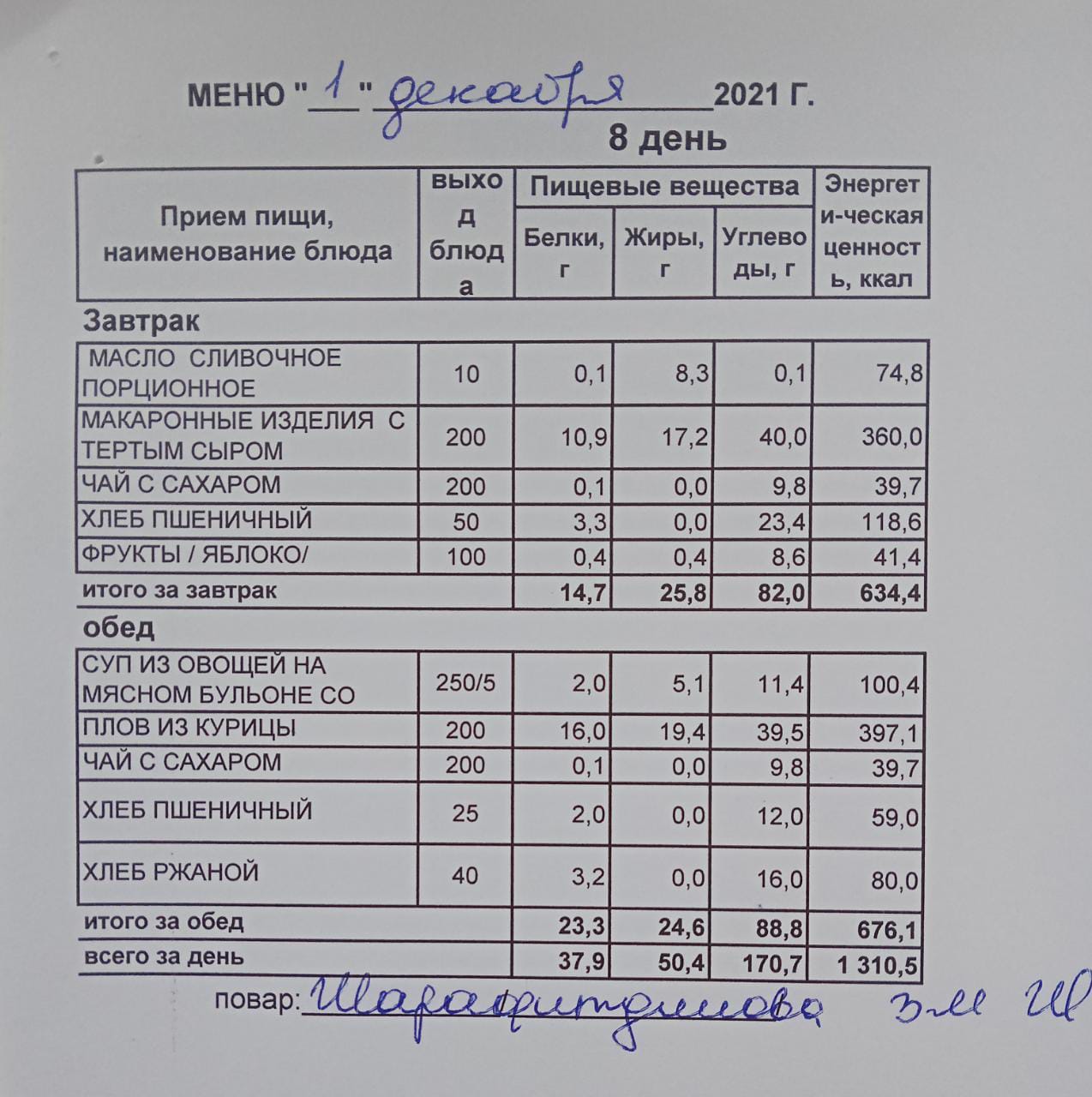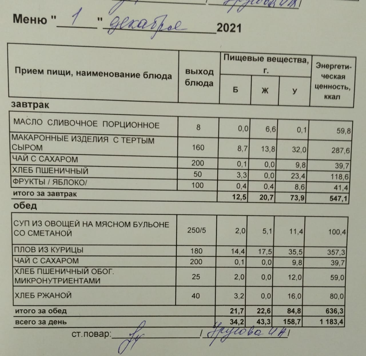 (Меню на 01.12.2021 г. обучающихся начального корпуса)