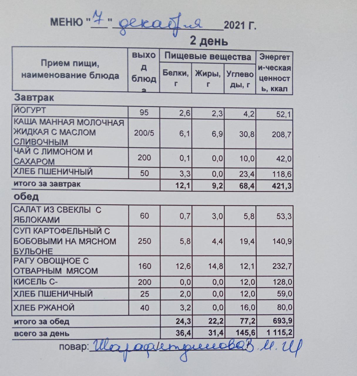 (Меню на 07.12.2021 г. обучающихся главного корпуса)