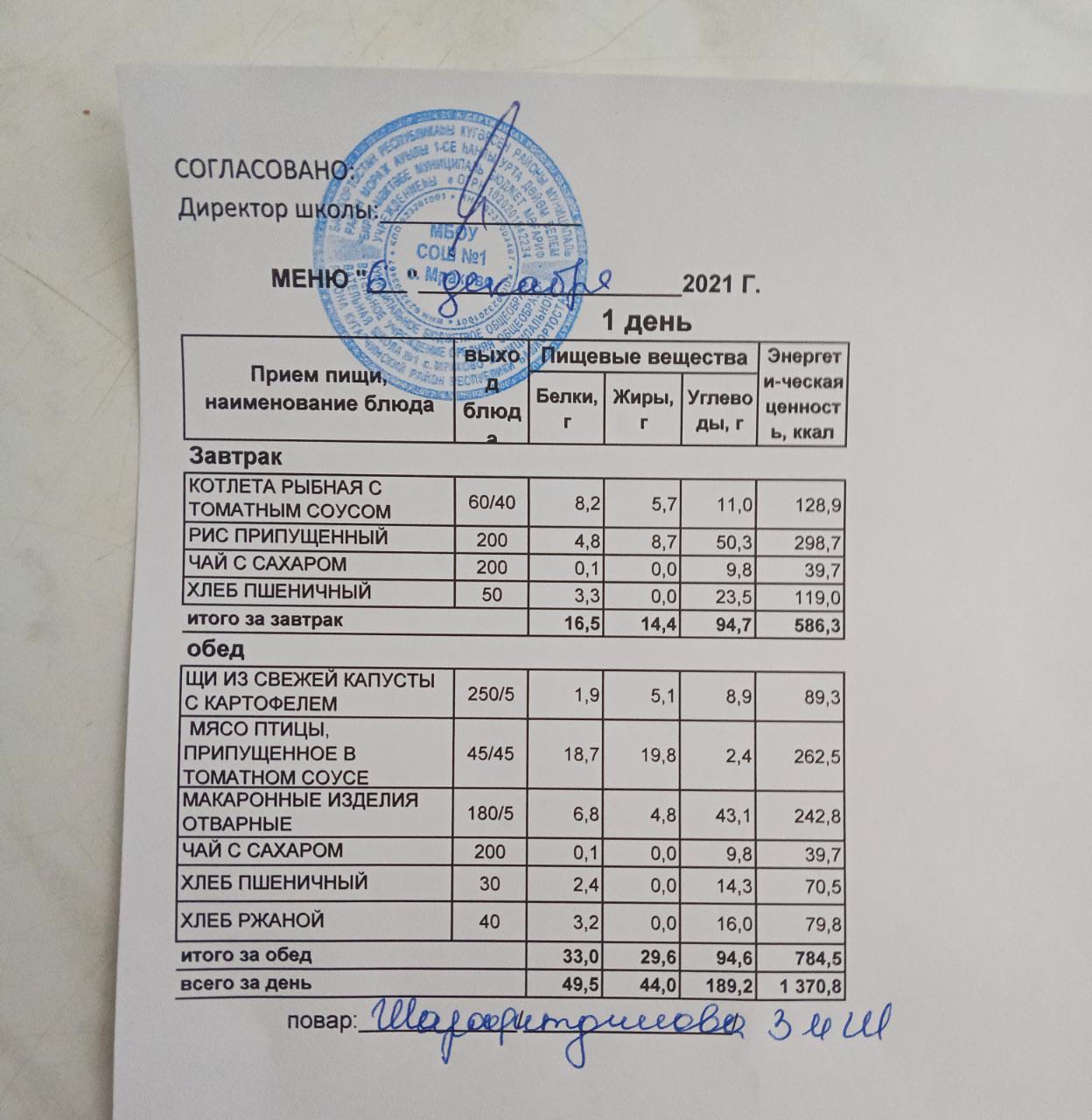 (Меню на 01.12.2021 г. обучающихся главного корпуса)