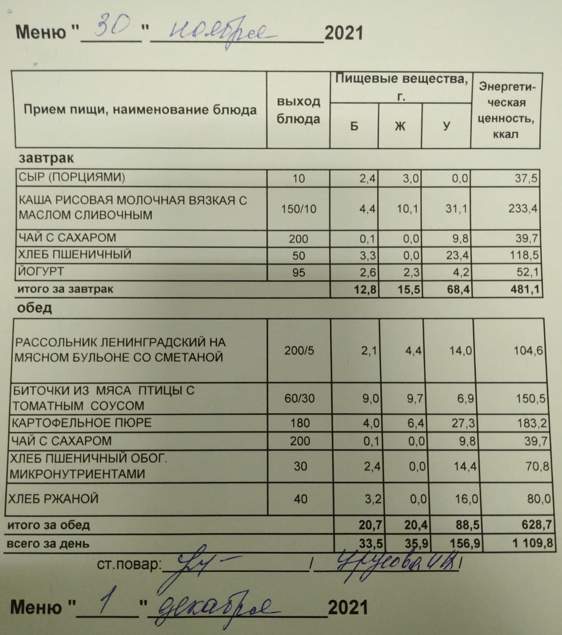 (Меню на 30.11.2021 г. обучающихся начального корпуса)