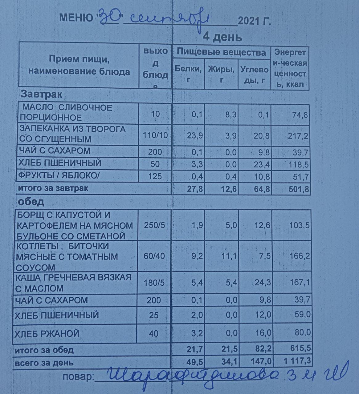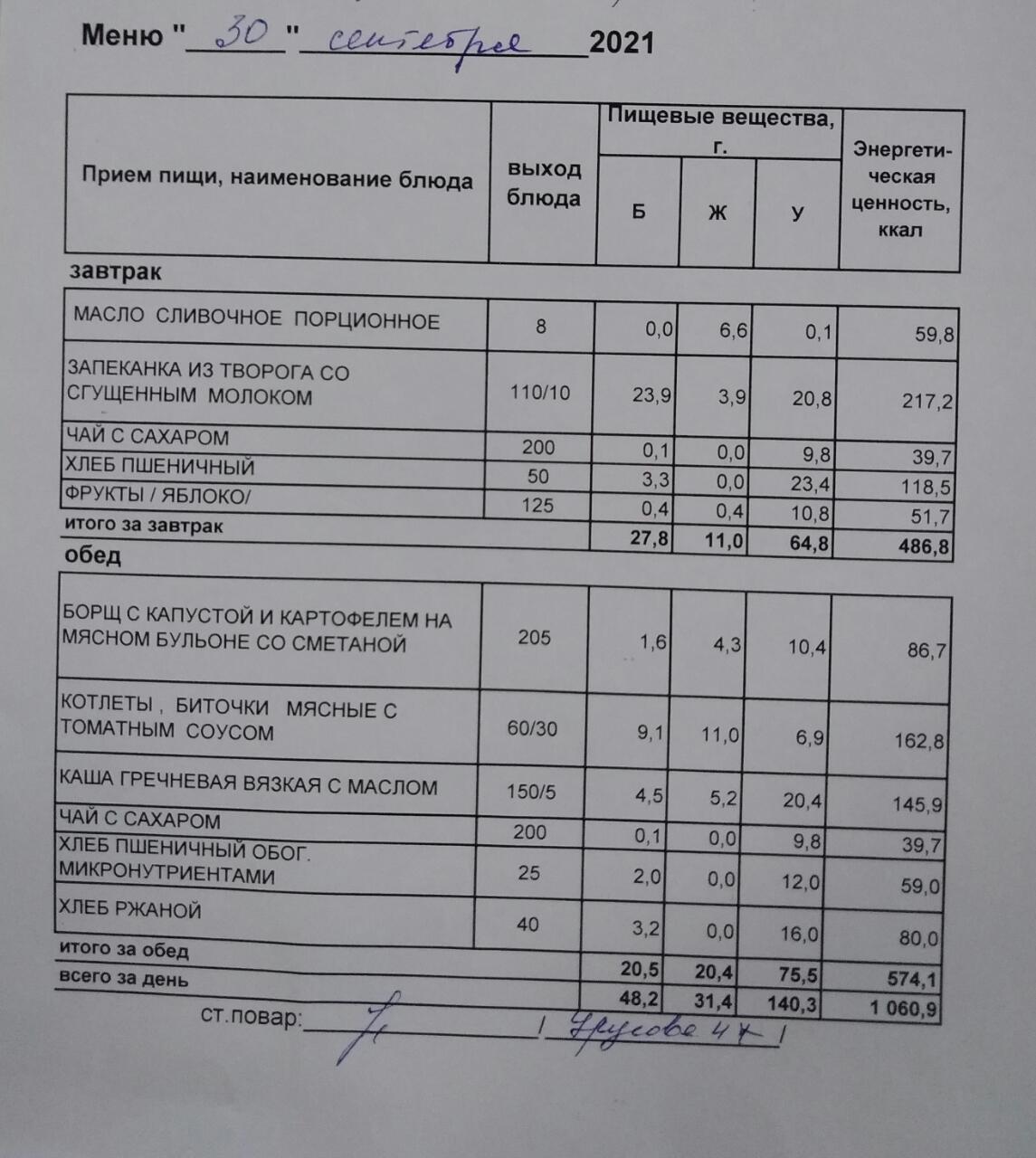 (Меню на 30.09.2021 г. обучающихся начального корпуса)
