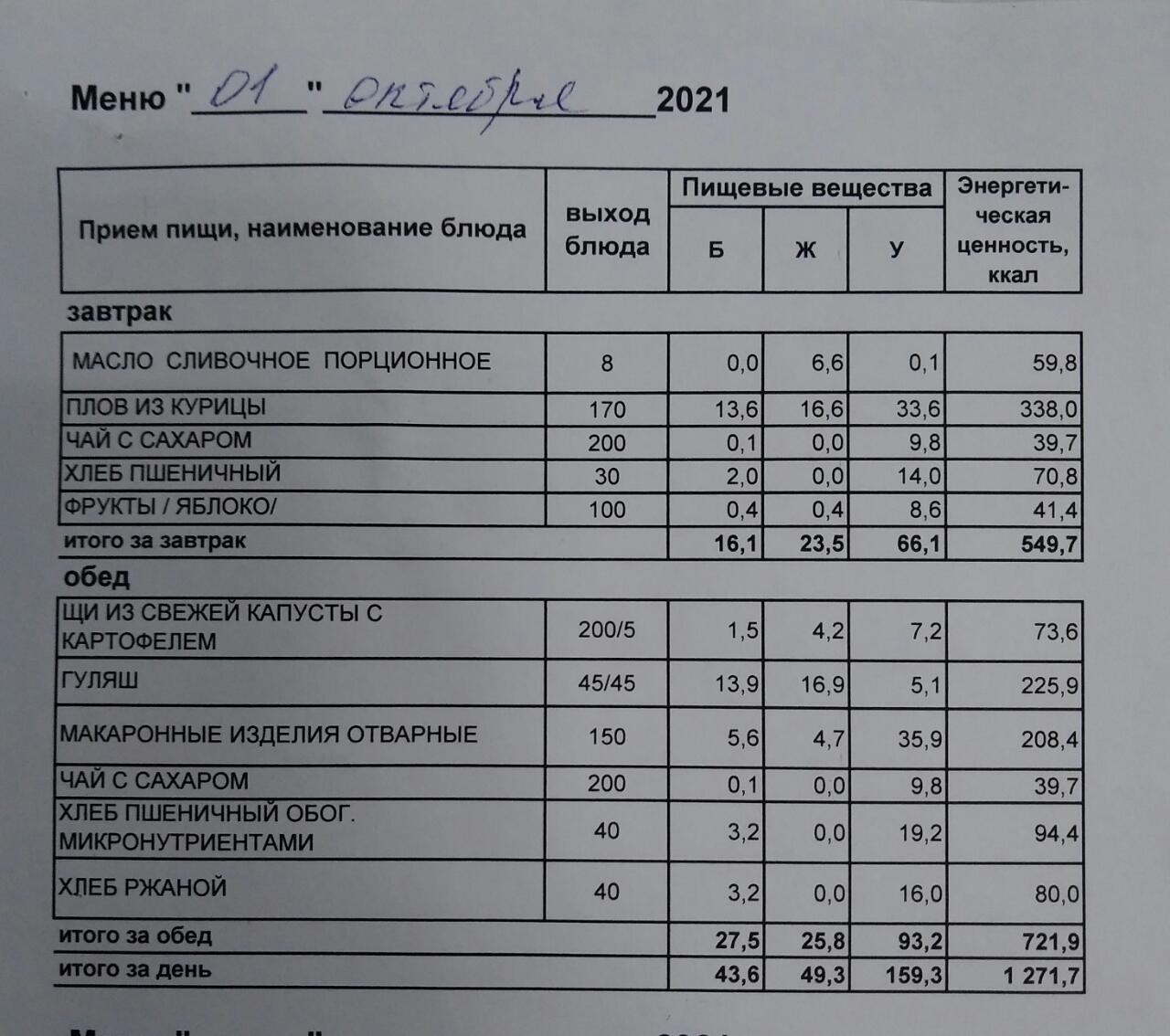 (Меню на 01.10.2021 г. обучающихся главного корпуса)