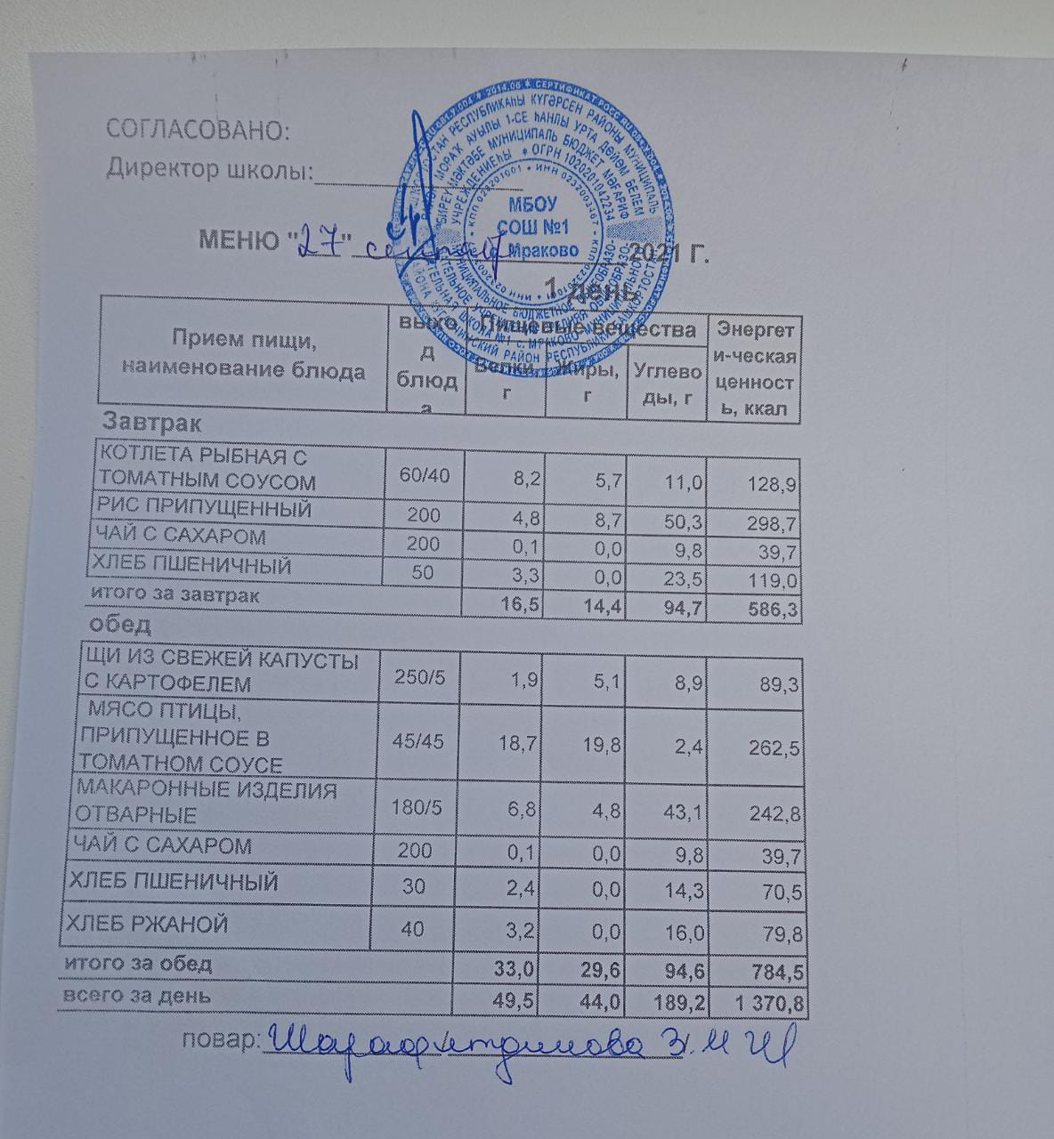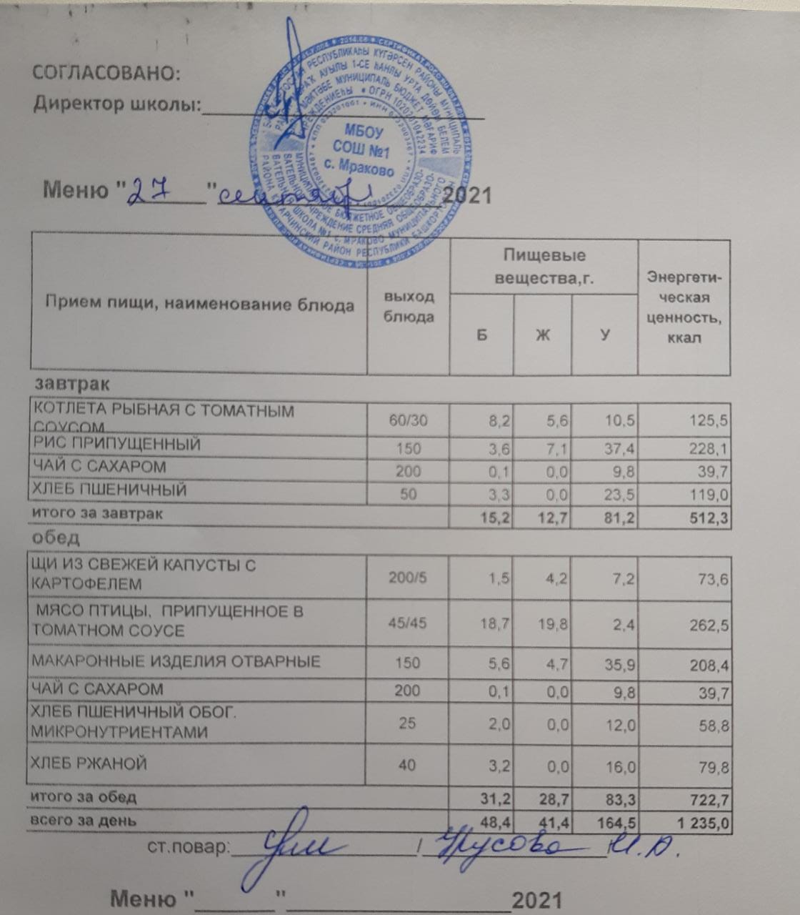 (Меню на 27.09.2021 г. обучающихся главного корпуса)