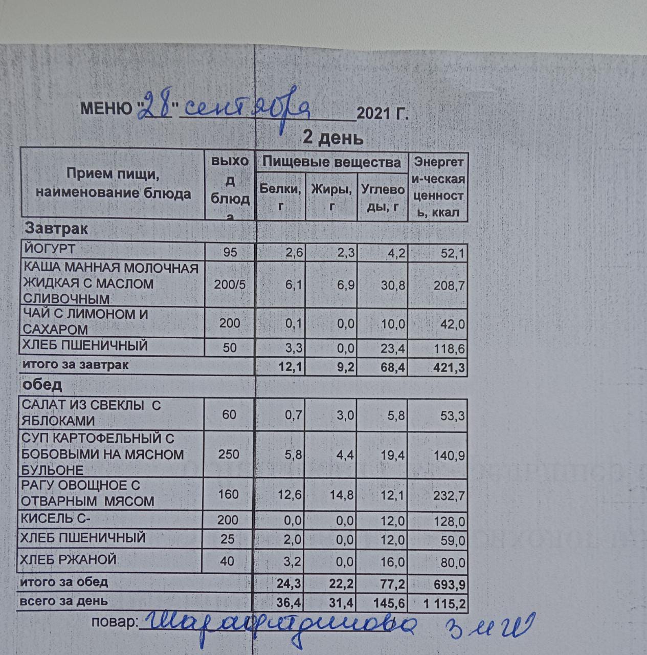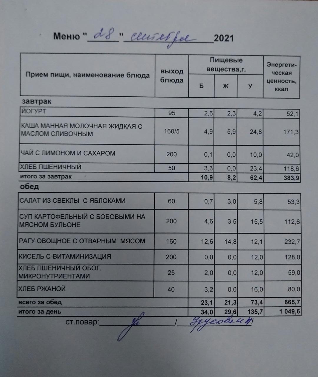 (Меню на 28.09.2021 г. обучающихся начального корпуса)