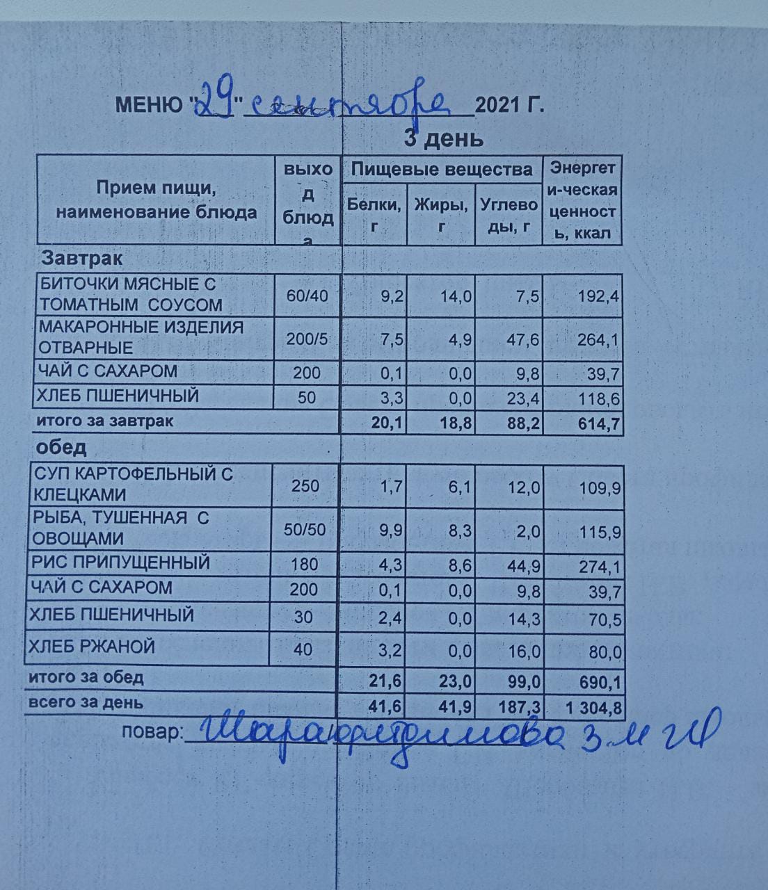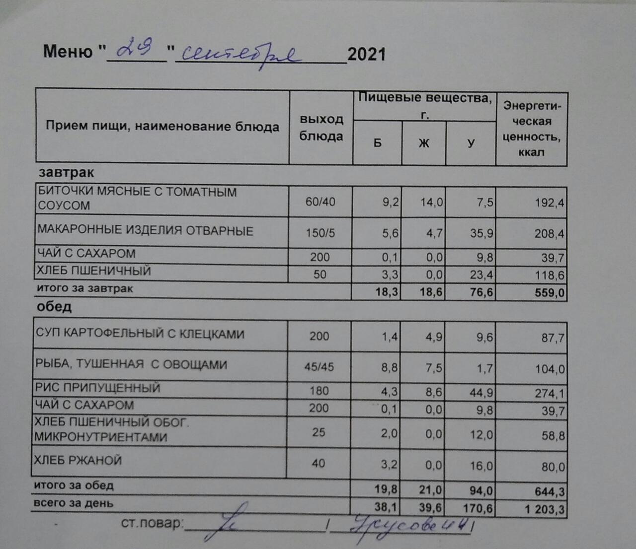 (Меню на 29.09.2021 г. обучающихся главного корпуса)