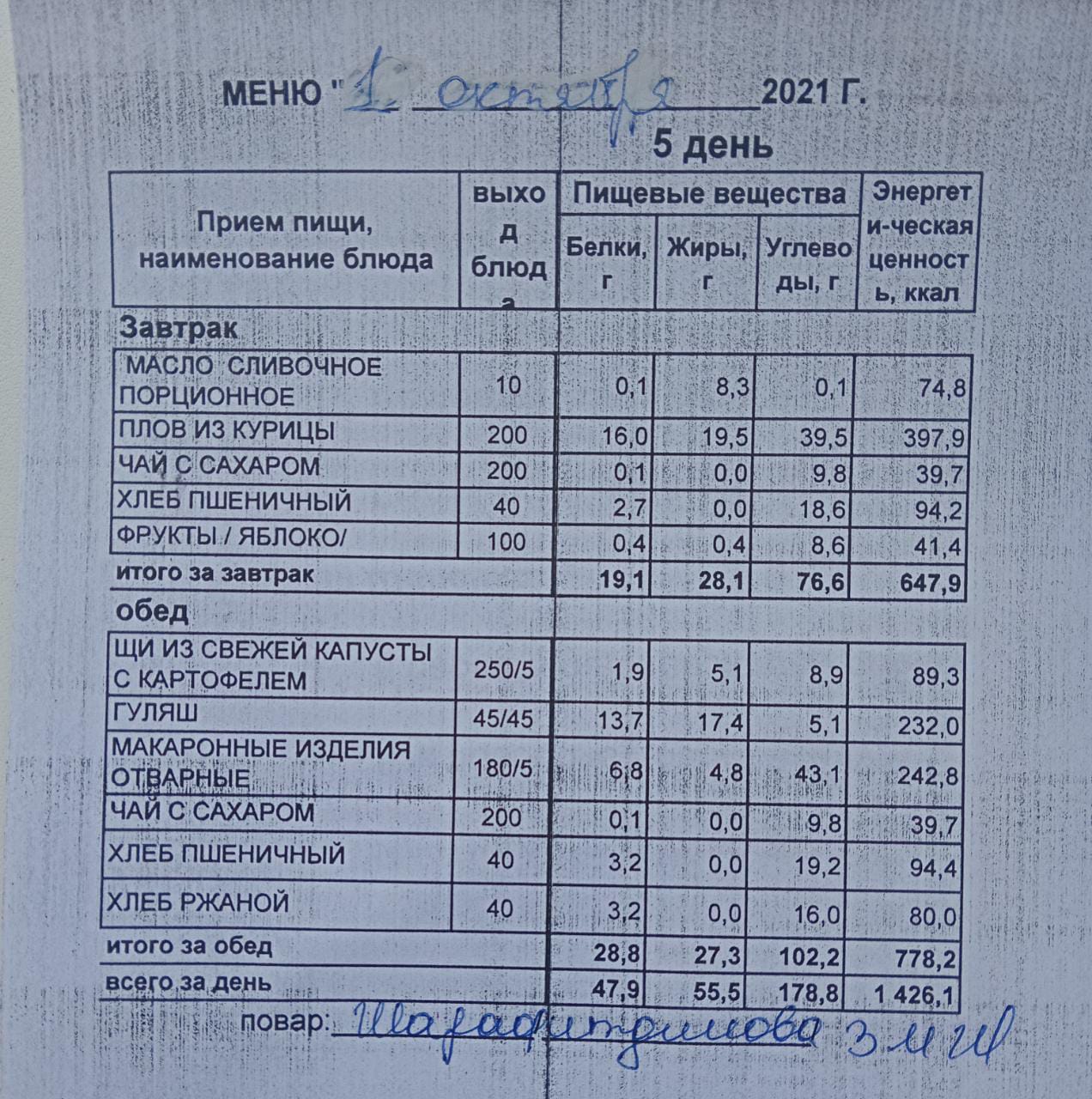 (Меню на 01.10.2021 г. обучающихся начального корпуса)