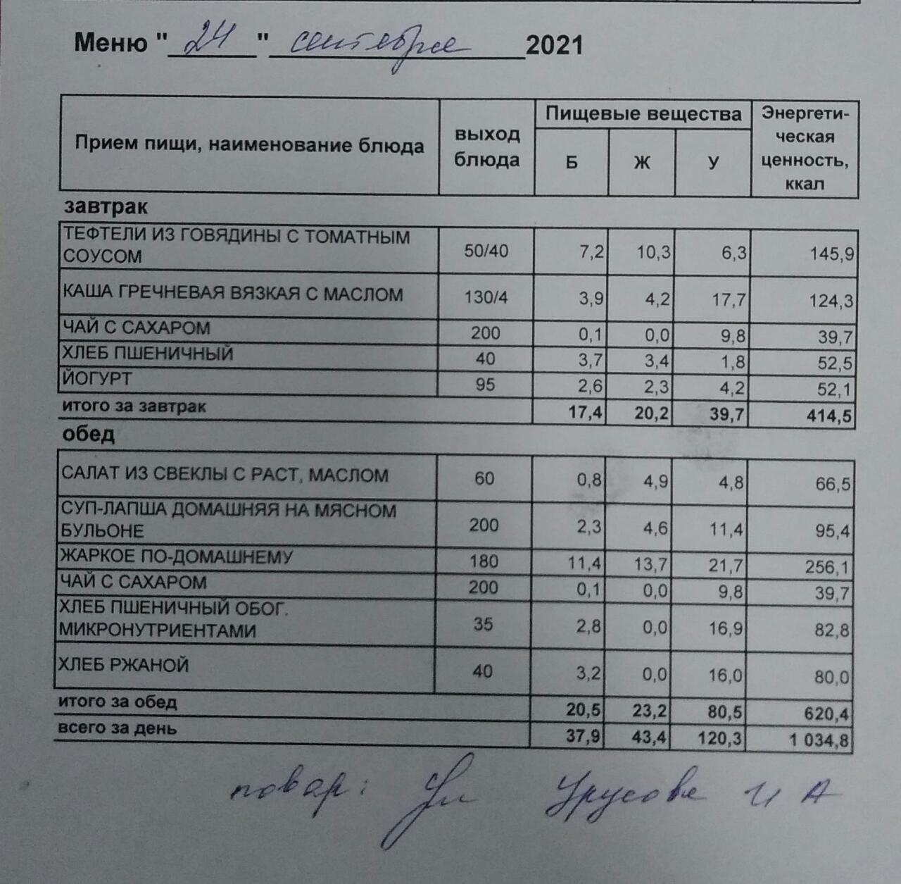 (Меню на 24.09.2021 г. обучающихся главного корпуса)