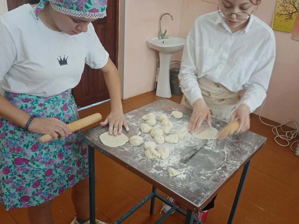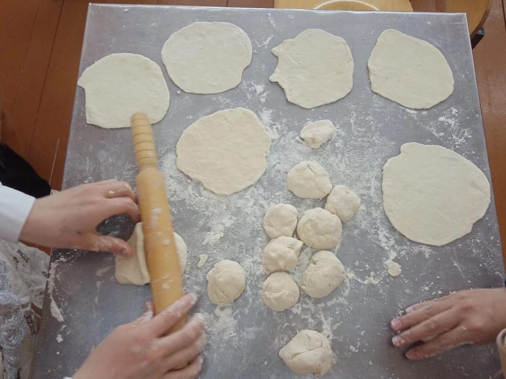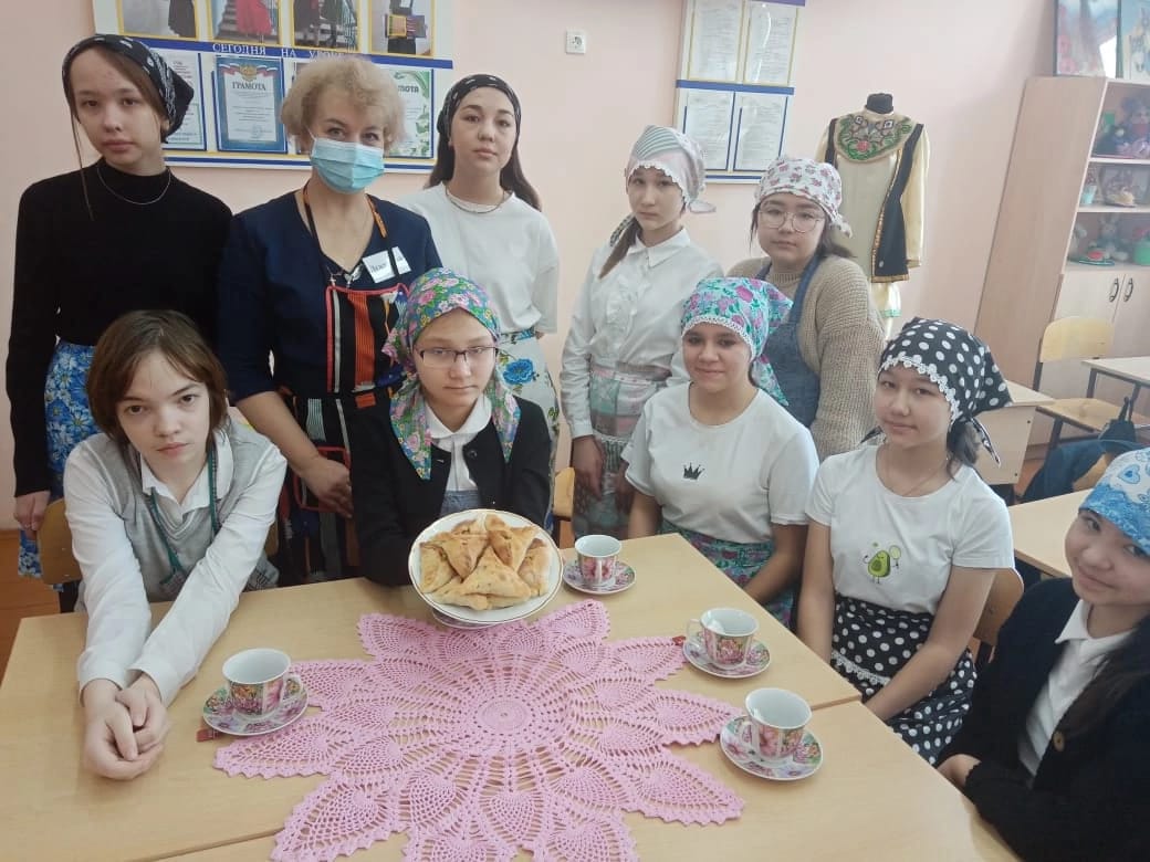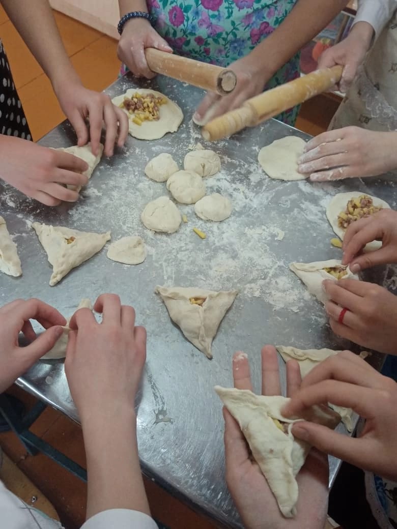 Учитель технологии Жердева Елена Юрьевна и девочки 7б класса приготовили национальное блюдо Вак беляш.