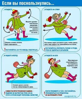 Если вы поскользнулись, сразу присядьте, чтобы снизить высоту падения. Сгруппируйтесь, чтобы исключить падение навзничь, в момент касания земли перекатитесь, чтобы смягчить силу удара.