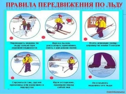 4. При движении по льду следует быть осторожным, внимательно следить за поверхностью льда, обходить опасные и подозрительные места. Следует остерегаться площадок, покрытых толстым слоем снега - под снегом лёд всегда тоньше, чем на открытом месте. Особенно осторожным нужно быть в местах, где быстрое течение, вблизи выступающих на поверхность кустов, осоки, травы, где ручьи впадают в водоёмы, выходят родники и вливаются тёплые сточные воды промышленных предприятий, где ведётся заготовка льда и т. п. Безопаснее всего переходить по прозрачному с зеленоватым оттенком льду толщиной не менее 7 см.